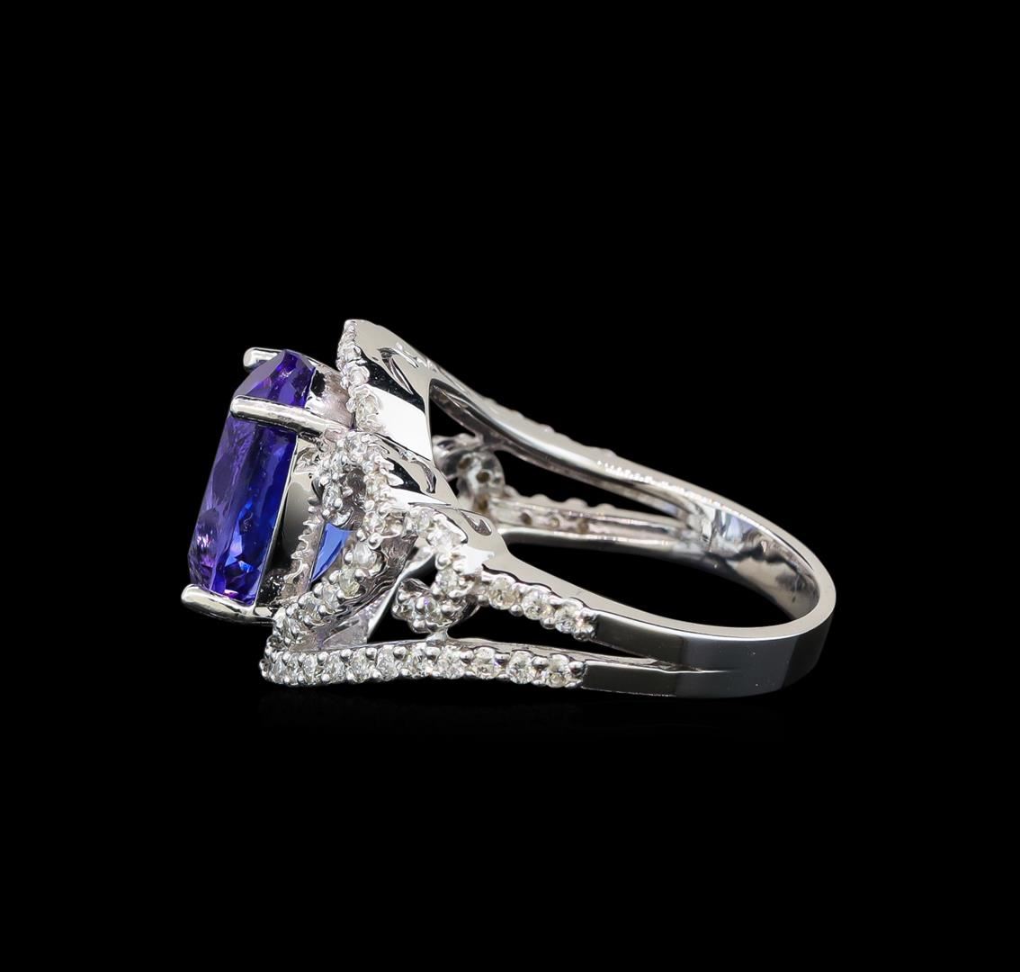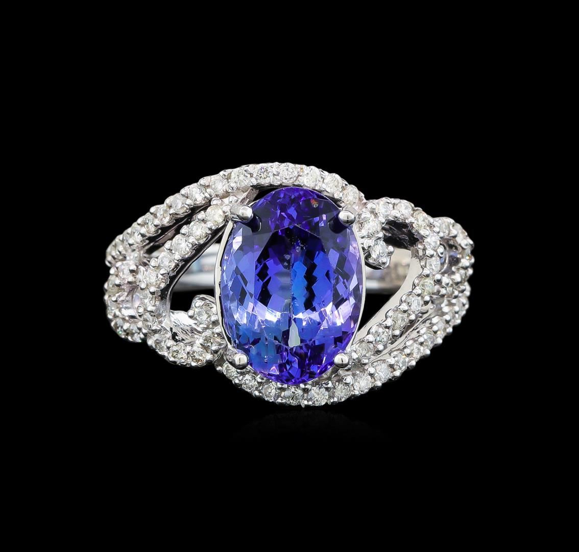 One electronically tested 14KT white gold ladies cast tanzanite and diamond ring with a bright polish finish. Identified with markings of "14K". Condition is new. Containing: One prong set oval modified brilliant cut natural tanzanite, measuring 11.00. x 8.00. x 5.21mm, approximate weight of 3.23ct., clarity is eye clean, type I, medium light, very slightly grayish, violet color, (GIA V 4/3), cut is good. Seventy-Six prong set round brilliant cut diamonds, measuring 1.30 - 1.30 x 0.78mm (depth est.) approximate total weight of 76 Stones = 0.61ct. Clarity: I-1 to I-2. Color: I - J. All diamonds and colored gemstones are graded in the mounting, unless otherwise stated. Colored gemstones are presumed to have been subjected to commonly used enhancement processes. Total Weight of Colored Stones 3.23ct. Total Weight of Diamonds 0.61ct. Total Weight of Ring 6.10 grams. GGL Appraised at $5,375.00.