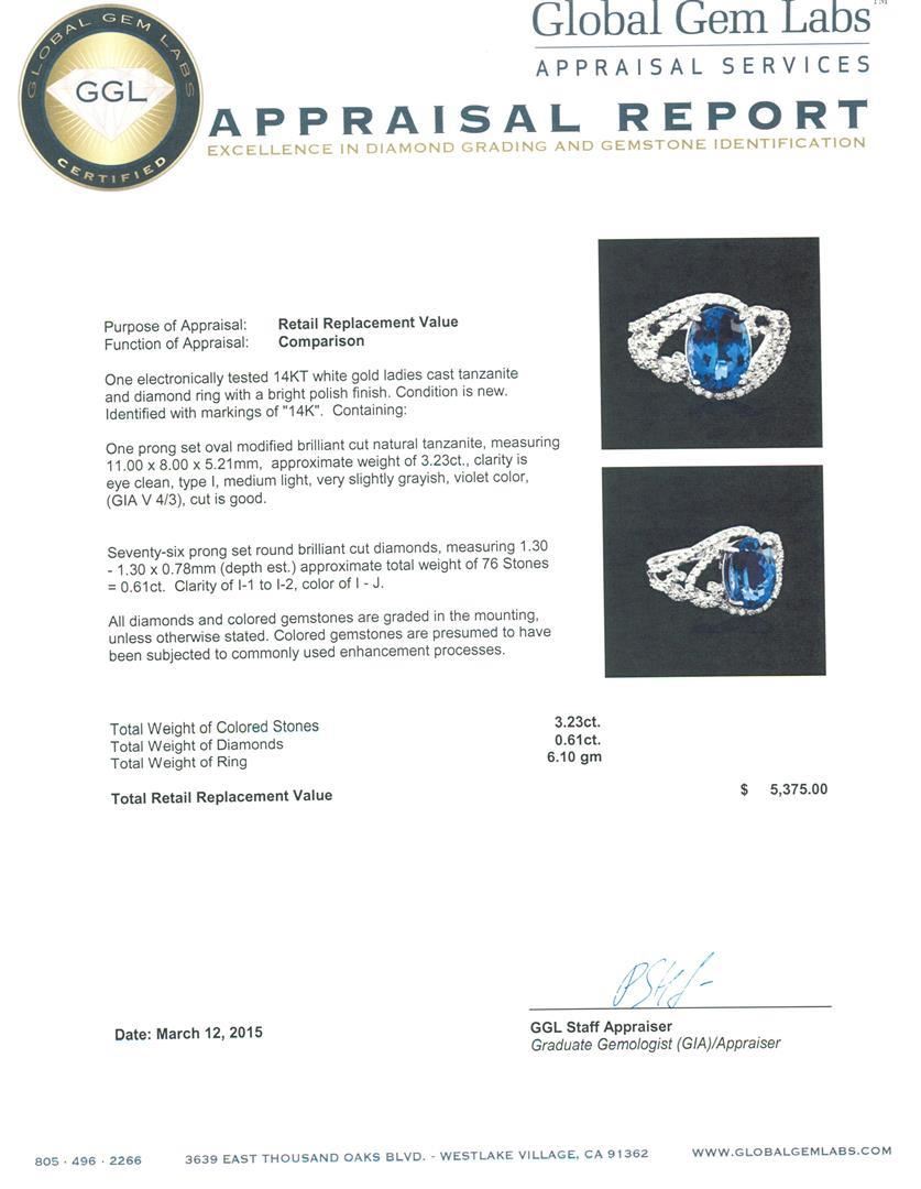 One electronically tested 14KT white gold ladies cast tanzanite and diamond ring with a bright polish finish. Identified with markings of "14K". Condition is new. Containing: One prong set oval modified brilliant cut natural tanzanite, measuring 11.00. x 8.00. x 5.21mm, approximate weight of 3.23ct., clarity is eye clean, type I, medium light, very slightly grayish, violet color, (GIA V 4/3), cut is good. Seventy-Six prong set round brilliant cut diamonds, measuring 1.30 - 1.30 x 0.78mm (depth est.) approximate total weight of 76 Stones = 0.61ct. Clarity: I-1 to I-2. Color: I - J. All diamonds and colored gemstones are graded in the mounting, unless otherwise stated. Colored gemstones are presumed to have been subjected to commonly used enhancement processes. Total Weight of Colored Stones 3.23ct. Total Weight of Diamonds 0.61ct. Total Weight of Ring 6.10 grams. GGL Appraised.