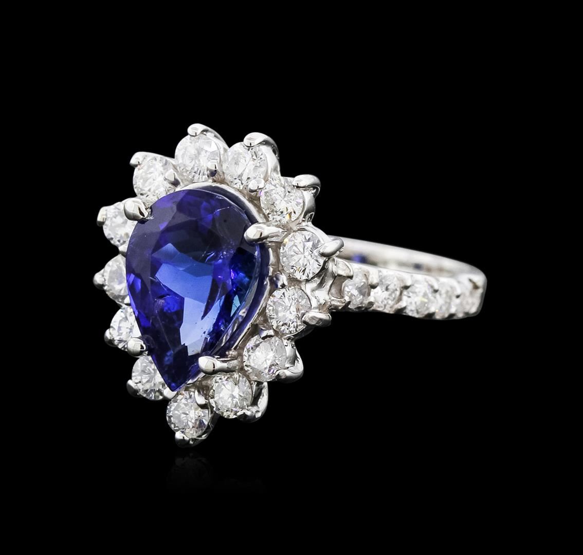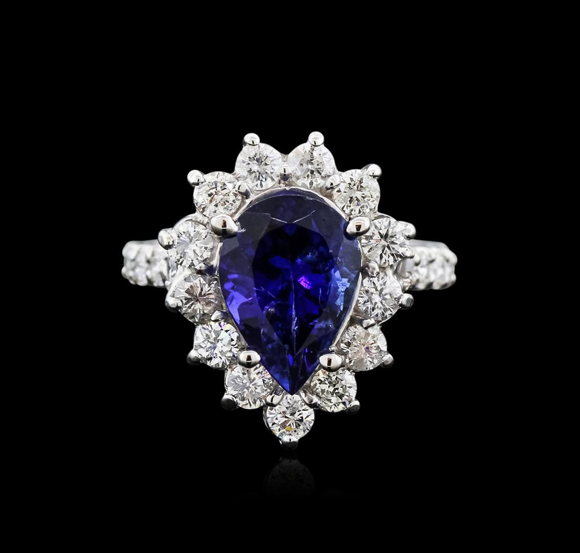 One electronically tested 14KT white gold ladies cast tanzanite and diamond ring with a flat shank with a bright polish finish. Identified with markings of "K14". Condition is new. Containing: One prong set pear modified brilliant cut natural tanzanite, measuring 10.88 x 7.75 x 5.76mm, approximate weight of 3.25ct., clarity is eye clean, type I, medium, moderately strong, violetish blue color, (GIA vB 5/4), cut is good. Thirteen prong set round brilliant cut diamonds, measuring 2.50 - 2.50 x 1.50mm (depth est.) approximate total weight of 13 Stones = 0.74ct. Clarity: SI-2 to I-1. Color: I - J. Twelve prong set round brilliant cut diamonds, measuring 2.00 - 2.00 x 1.20mm (depth est.) approximate total weight of 12 Stones = 0.35ct. Clarity: SI-2 to I-1. Color: I - J. All diamonds and colored gemstones are graded in the mounting, unless otherwise stated. Colored gemstones are presumed to have been subjected to commonly used enhancement processes. Total Weight of Colored Stones 3.25ct. Total Weight of Diamonds 1.09ct. Total Weight of Ring 4.70 grams. GGL Appraised at $6,645.00.