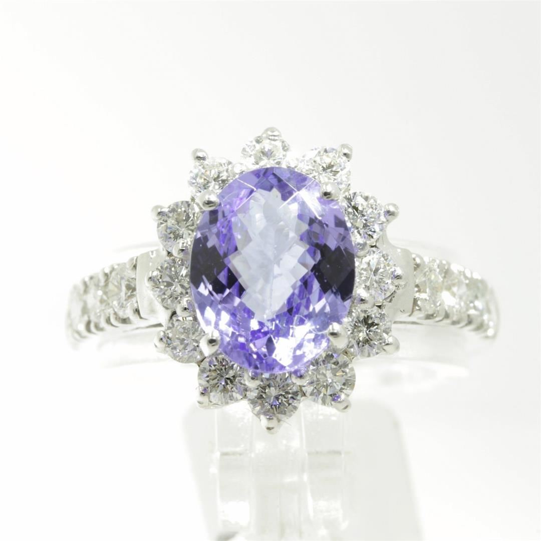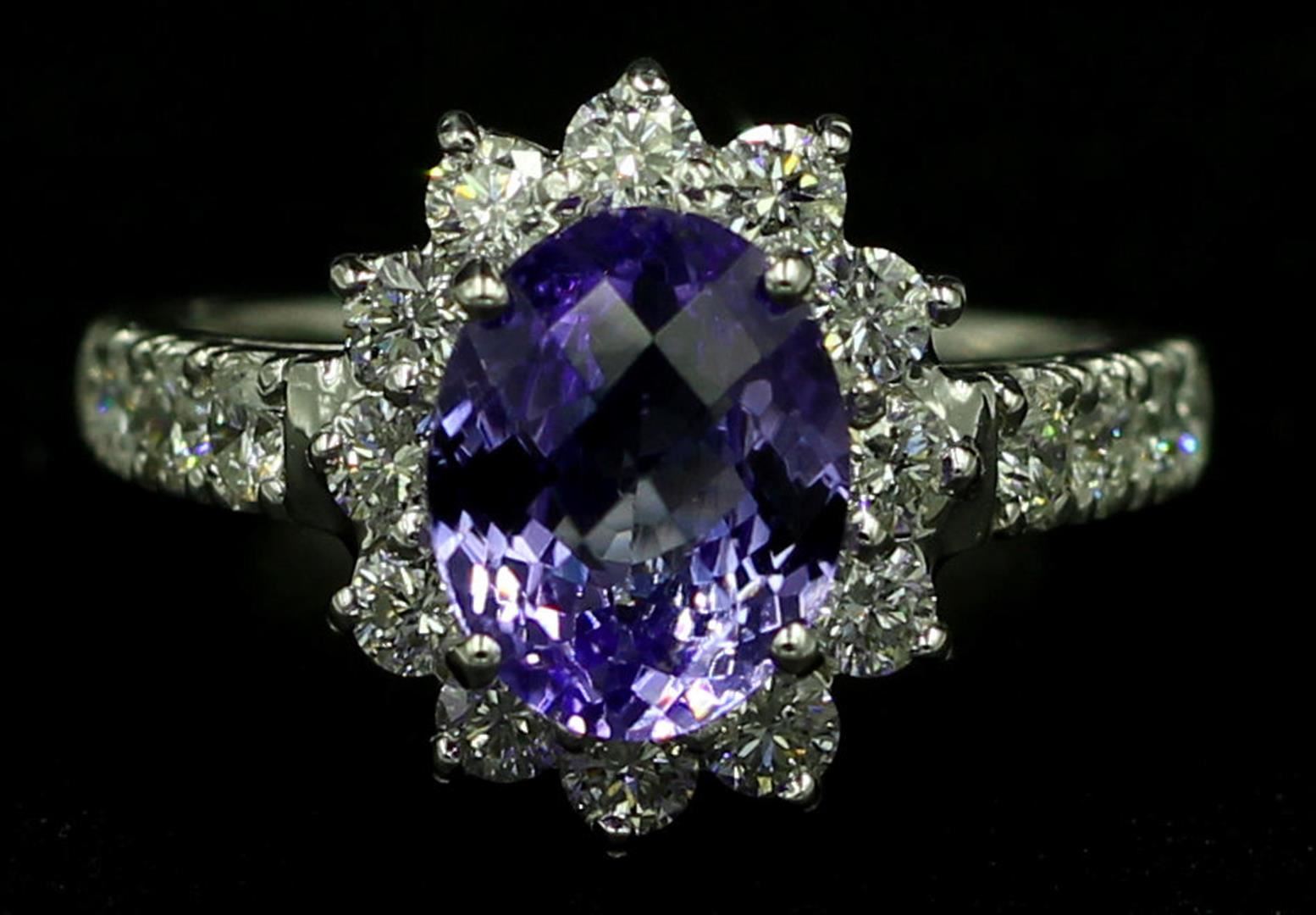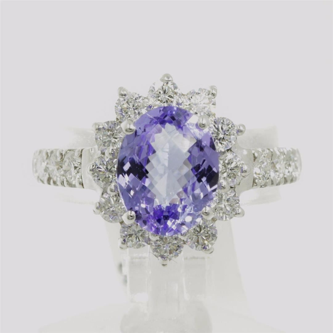 One Oval Cut Tanzanite Diamond Anniversary Band Ring in 14k White Gold. Size 6.50 but resizable. Total Carat weight is 3.26 Ct. Setting style is solitaire with accents / rare gem. Gross weight is 4.16 grams. Total stones is 25. Condition is brand new. Main stone is natural and non-enhanced. Main diamond carat is 2.12 Ct, shape oval, clarity fine medium color, color is blue tanzanite, and cut is very good. Side stone is natural and non-enhanced. Side stone total carats is 1.14 Ct. Shape is brilliant round cut, clarity is SI-1, color G-H, cut is very good, and number of side diamonds is 24.