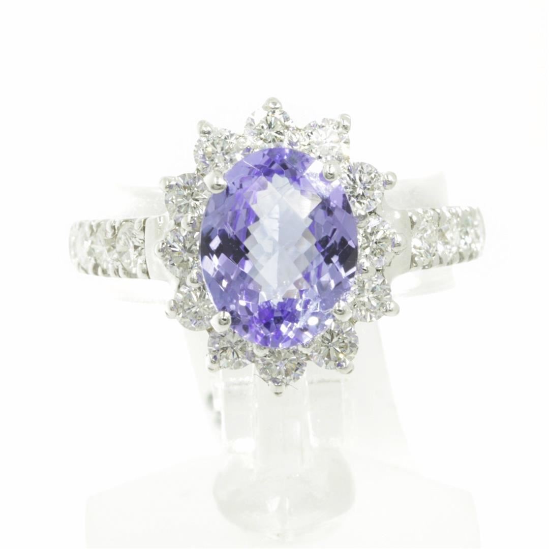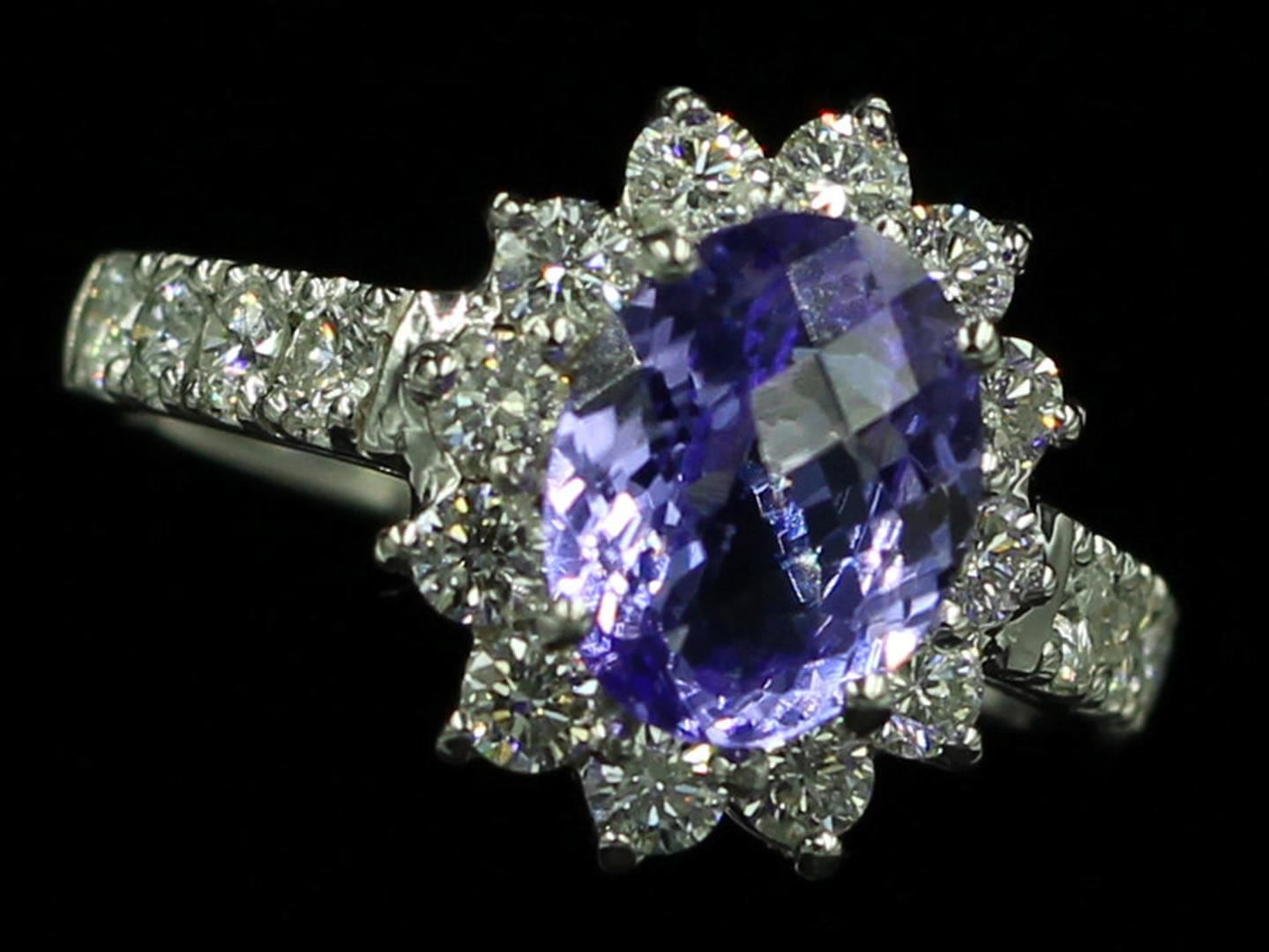One Oval Cut Tanzanite Diamond Anniversary Band Ring in 14k White Gold. Size 6.50 but resizable. Total Carat weight is 3.26 Ct. Setting style is solitaire with accents / rare gem. Gross weight is 4.16 grams. Total stones is 25. Condition is brand new. Main stone is natural and non-enhanced. Main diamond carat is 2.12 Ct, shape oval, clarity fine medium color, color is blue tanzanite, and cut is very good. Side stone is natural and non-enhanced. Side stone total carats is 1.14 Ct. Shape is brilliant round cut, clarity is SI-1, color G-H, cut is very good, and number of side diamonds is 24.