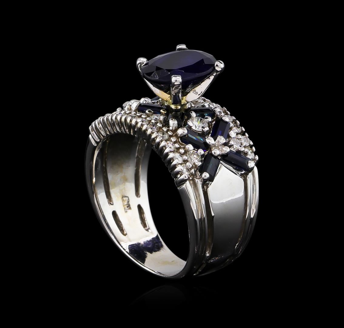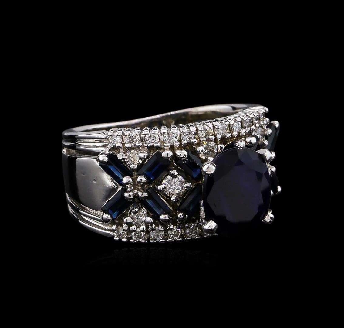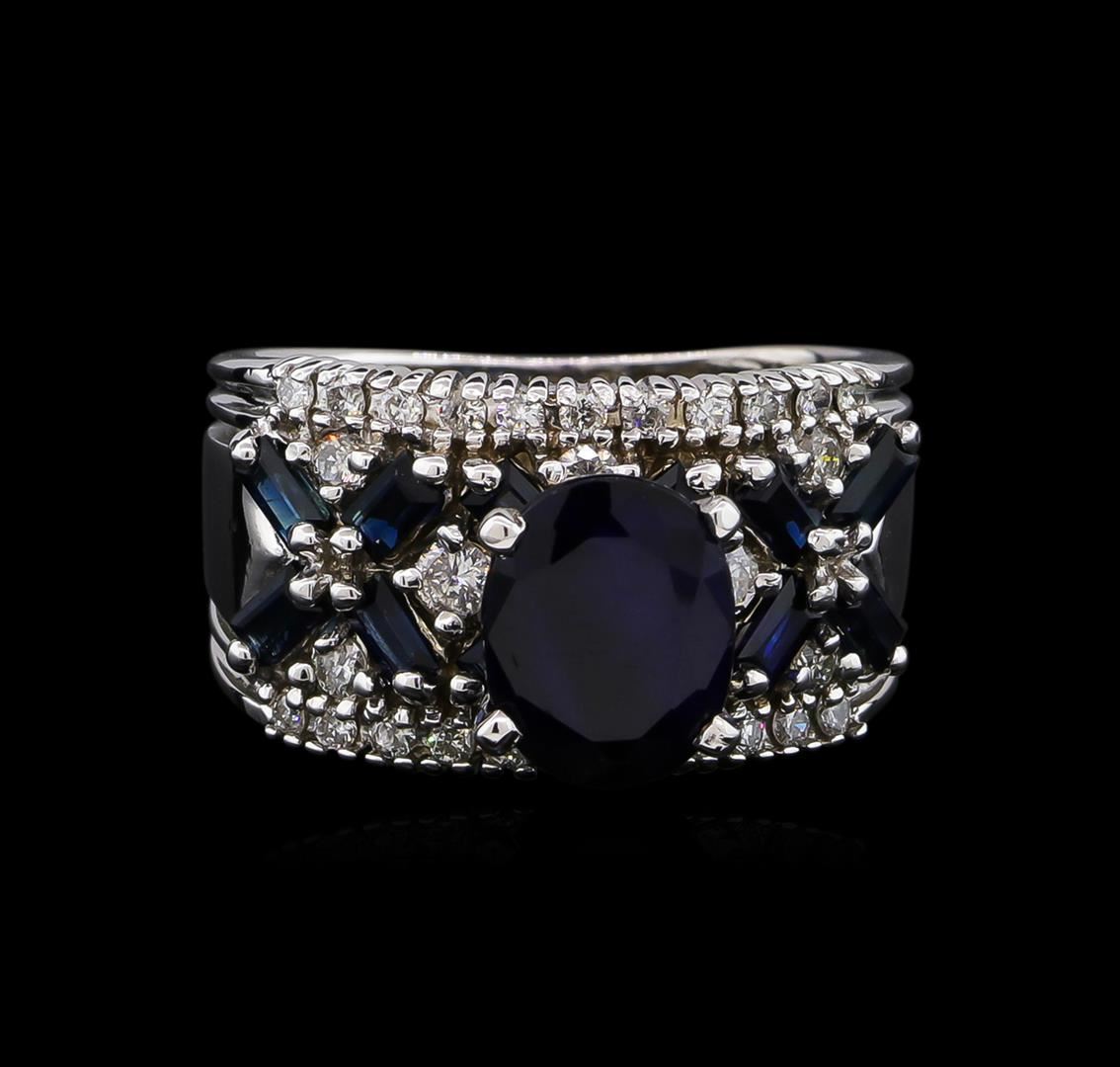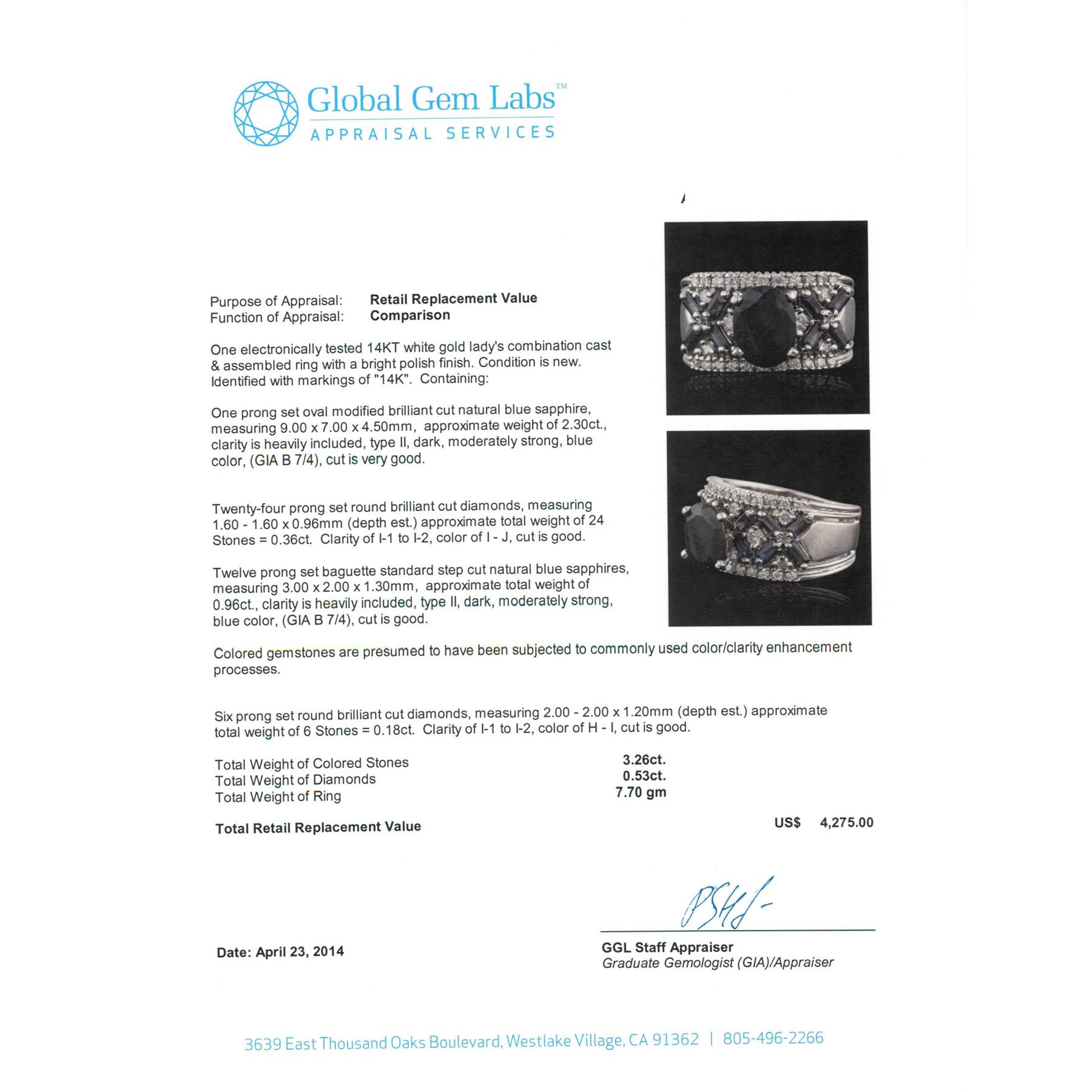 One electronically tested 14KT white gold Ladies combination cast & assembled ring with a bright polish finish. Condition is new. Identified with markings of "14K". Containing: One prong set oval modified brilliant cut natural blue sapphire, measuring 9.00 x 7.00 x 4.50mm, approximate weight of 2.30ct., clarity is heavily included, type II, dark, moderately strong, blue color, (GIA B 7/4), cut is very good. Twenty-Four prong set round brilliant cut diamonds, measuring 1.60 - 1.60 x 0.96mm (depth est.) approximate. Total Weight of 24 Stones = 0.36ct. Clarity: I-1 to I-2. Color: I - J, Cut is Good. Twelve prong set baguette standard step cut natural blue sapphires, measuring 3.00 x 2.00 x 1.30mm, approximate. Total Weight of 0.96ct., clarity is heavily included, type II, dark, moderately strong, blue color, (GIA B 7/4), cut is good. Colored gemstones are presumed to have been subjected to commonly used color/clarity enhancement processes. Six prong set round brilliant cut diamonds, measuring 2.00 - 2.00 x 1.20mm (depth est.) approximate. Total Weight of 6 Stones = 0.18ct. Clarity: I-1 to I-2. Color: H - I, Cut is Good. Total Weight of Colored Stones 3.26ct. Total Weight of Diamonds 0.53ct. Total Weight of Ring 7.70 grams. GGL Appraised at $4,275.00.