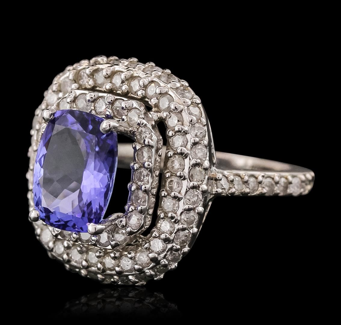 One electronically tested 14KT white gold ladies cast tanzanite & diamond ring with a bright finish. The featured tanzanite is set within tiered diamond bezels, supported by diamond set shoulders, completed by a two millimeter wide band. Condition is good. Containing: One prong set rectangular cushion mixed cut natural tanzanite, measuring 10.00 x 8.00 x 4.70mm, 10% bulge factor, approximate weight of 3.26ct., clarity is eye clean, type I, medium dark, slightly grayish, bluish violet color, (GIA bV 6/2), cut is good. Transmitting light with no distortion, transparent. Graded in the setting. Tanzanite is a very rare gemstone that is only found in the country of Tanzania. Originally discovered in 1967. Tiffany & Company, named the stone Tanzanite. It is found in the Usumburu Mountains that border the Umba Valley of northern Tanzania. Tanzanite occurs in gray, brown, violet, blue, reddish-purple, & green. The gem is interesting because of its exceptional pleochroism. Rotated in different directions a tanzanite will exhibit multiple changes of color. Tanzanite has a low tolerance to ultrasonic cleaning, and should not be cleaned using this method. One Hundred Four prong set round brilliant cut diamonds, measuring 1.70 - 1.50 x 0.96mm (depth est.) approximate total weight of 104 Stones = 1.50ct. Graded in the setting. Clarity: I-2 to I-3. Color: H - J. Total Weight of Colored Stones 3.26ct. Total Weight of Diamonds 1.50ct. Total Weight of Ring 9.50 grams. AIG Appraised at $9,750.00.