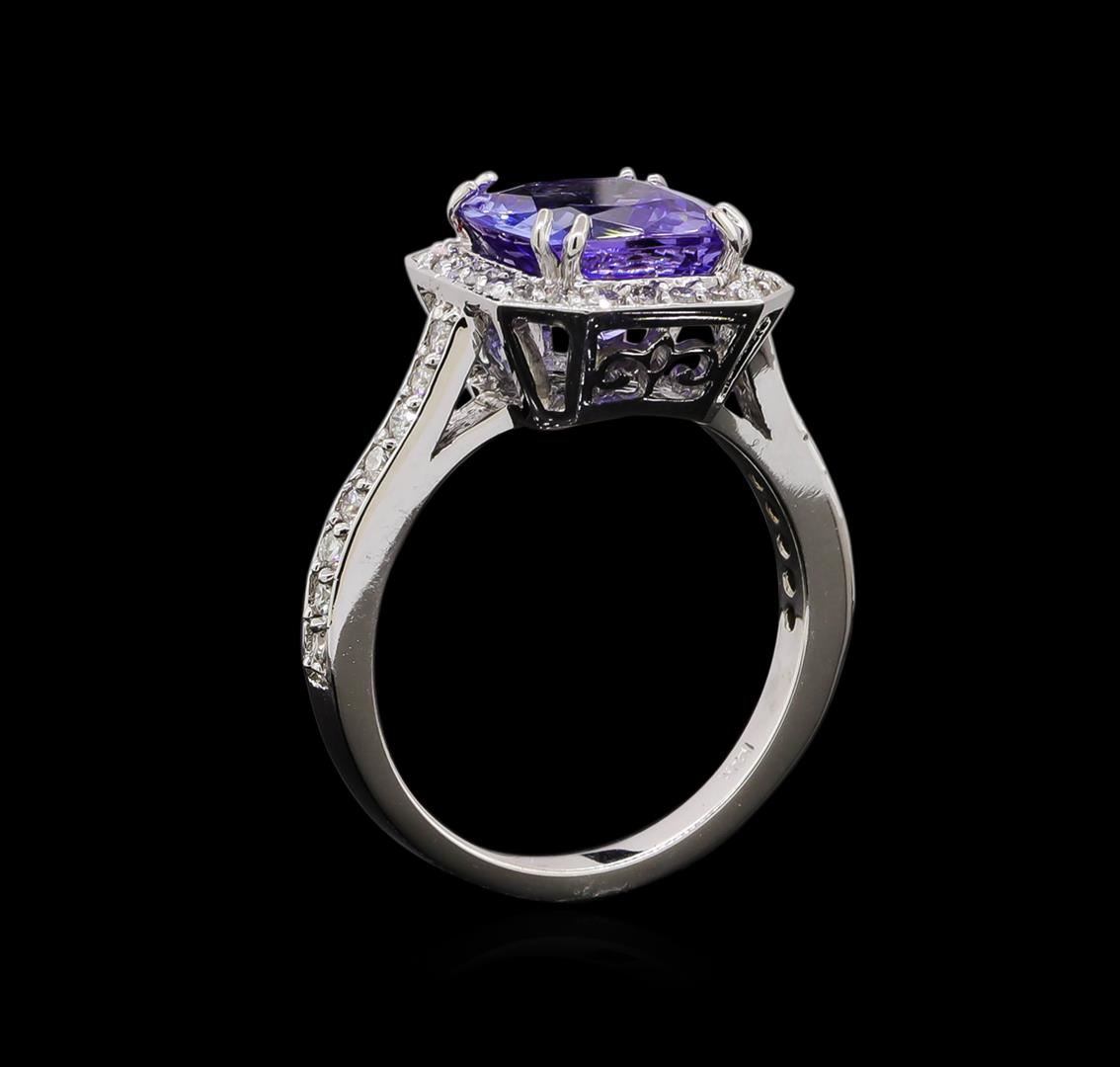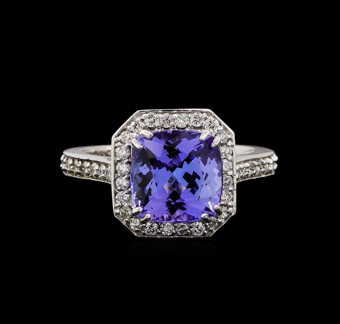 One electronically tested 14KT white gold ladies cast tanzanite and diamond ring with a bright polish finish. Identified with markings of "14K". Condition is new. Containing: One prong set square cushion modified brilliant cut natural tanzanite, measuring 8.90 x 8.90 x 5.23mm, approximate weight of 3.26ct., clarity is eye clean, type I, medium light, very slightly grayish, violet color, (GIA V 4/3), cut is good. One Hundred Six prong set round brilliant cut diamonds, measuring 1.80 - 1.00 x 0.84mm (depth est.) approximate total weight of 106 Stones = 1.06ct. Clarity: SI-1 to I-1. Color: I - J, Cut is Good. Colored gemstones are presumed to have been subjected to commonly used enhancement processes. All diamonds and colored gemstones are graded in the mounting, unless otherwise stated. Total Weight of Colored Stones 3.26ct. Total Weight of Diamonds 1.06ct. Total Weight of Ring 4.70 grams. GGL Appraised at $4,325.00.