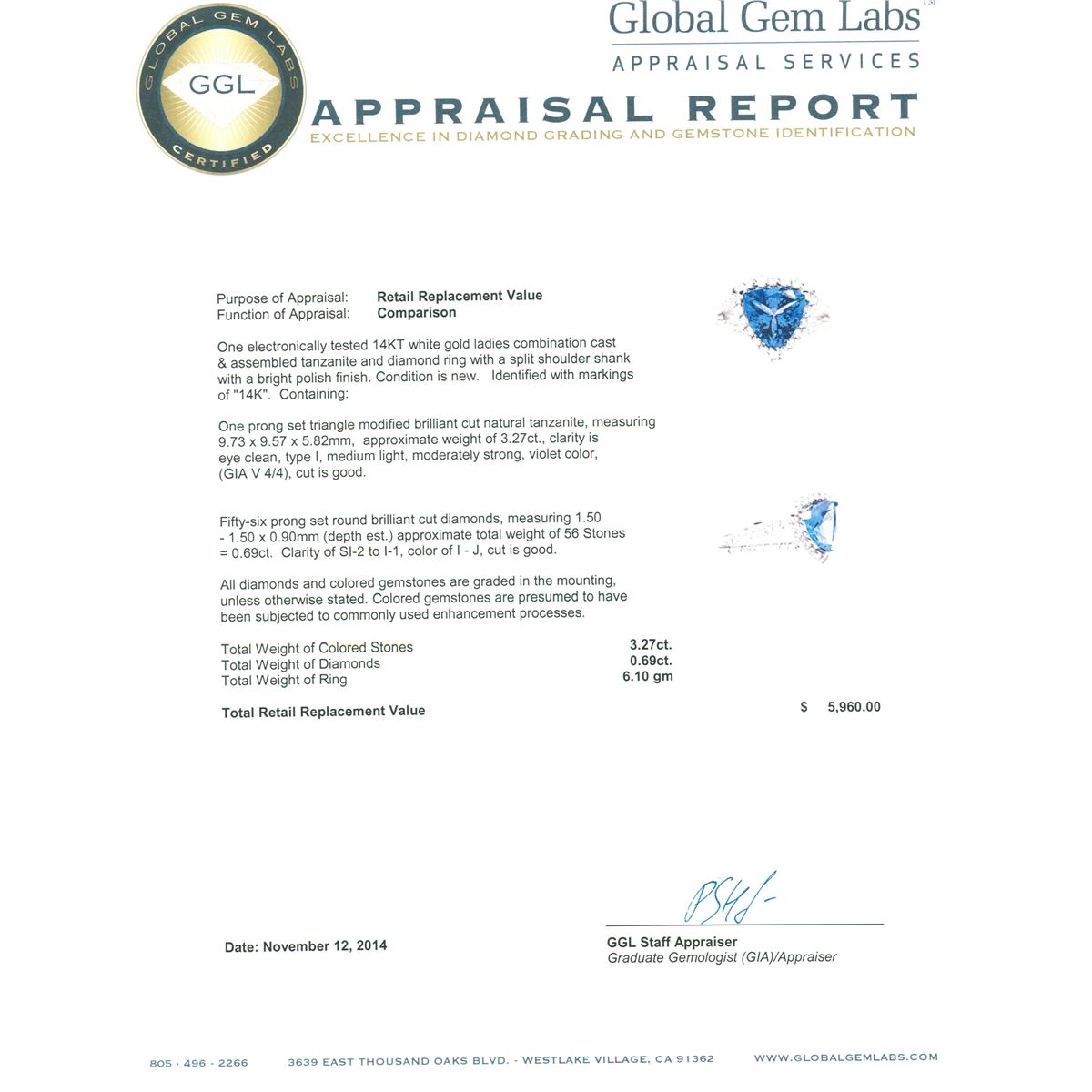 One electronically tested 14KT white gold ladies combination cast & assembled tanzanite and diamond ring with a split shoulder shank with a bright polish finish. Identified with markings of "14K". Condition is new. Containing: One prong set triangle modified brilliant cut natural tanzanite, measuring 9.73 x 9.57 x 5.82mm, approximate weight of 3.27ct., clarity is eye clean, type I, medium light, moderately strong, violet color, (GIA V 4/4), cut is good. Fifty-Six prong set round brilliant cut diamonds, measuring 1.50 - 1.50 x 0.90mm (depth est.) approximate total weight of 56 Stones = 0.69ct. Clarity: SI-2 to I-1. Color: I - J, Cut is Good. All diamonds and colored gemstones are graded in the mounting, unless otherwise stated. Colored gemstones are presumed to have been subjected to commonly used enhancement processes. Total Weight of Colored Stones 3.27ct. Total Weight of Diamonds 0.69ct. Total Weight of Ring 6.10 grams. GGL Appraised at $5,960.00.
