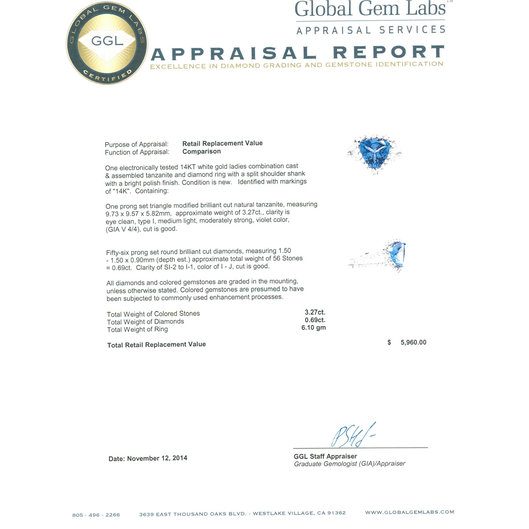 One electronically tested 14KT white gold ladies combination cast & assembled tanzanite and diamond ring with a split shoulder shank with a bright polish finish. Identified with markings of "14K". Condition is new. Containing: One prong set triangle modified brilliant cut natural tanzanite, measuring 9.73 x 9.57 x 5.82mm, approximate weight of 3.27ct., clarity is eye clean, type I, medium light, moderately strong, violet color, (GIA V 4/4), cut is good. Fifty-Six prong set round brilliant cut diamonds, measuring 1.50 - 1.50 x 0.90mm (depth est.) approximate total weight of 56 Stones = 0.69ct. Clarity: SI-2 to I-1. Color: I - J, Cut is Good. All diamonds and colored gemstones are graded in the mounting, unless otherwise stated. Colored gemstones are presumed to have been subjected to commonly used enhancement processes. Total Weight of Colored Stones 3.27ct. Total Weight of Diamonds 0.69ct. Total Weight of Ring 6.10 grams. GGL Appraised at $5,960.00.