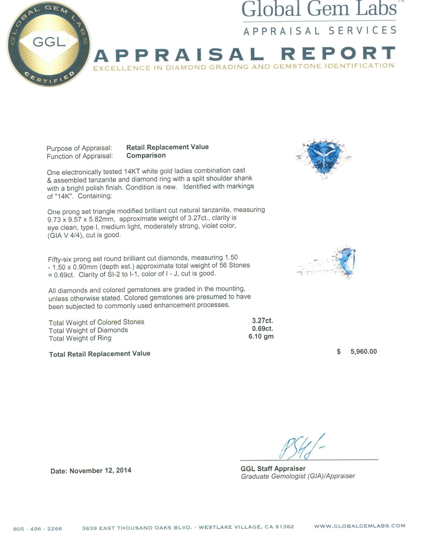 One electronically tested 14KT white gold ladies combination cast & assembled tanzanite and diamond ring with a split shoulder shank with a bright polish finish. Identified with markings of "14K". Condition is new. Containing: One prong set triangle modified brilliant cut natural tanzanite, measuring 9.73 x 9.57 x 5.82mm, approximate weight of 3.27ct., clarity is eye clean, type I, medium light, moderately strong, violet color, (GIA V 4/4), cut is good. Fifty-Six prong set round brilliant cut diamonds, measuring 1.50 - 1.50 x 0.90mm (depth est.) approximate total weight of 56 Stones = 0.69ct. Clarity: SI-2 to I-1. Color: I - J, Cut is Good. All diamonds and colored gemstones are graded in the mounting, unless otherwise stated. Colored gemstones are presumed to have been subjected to commonly used enhancement processes. Total Weight of Colored Stones 3.27ct. Total Weight of Diamonds 0.69ct. Total Weight of Ring 6.10 grams. GGL Appraised.