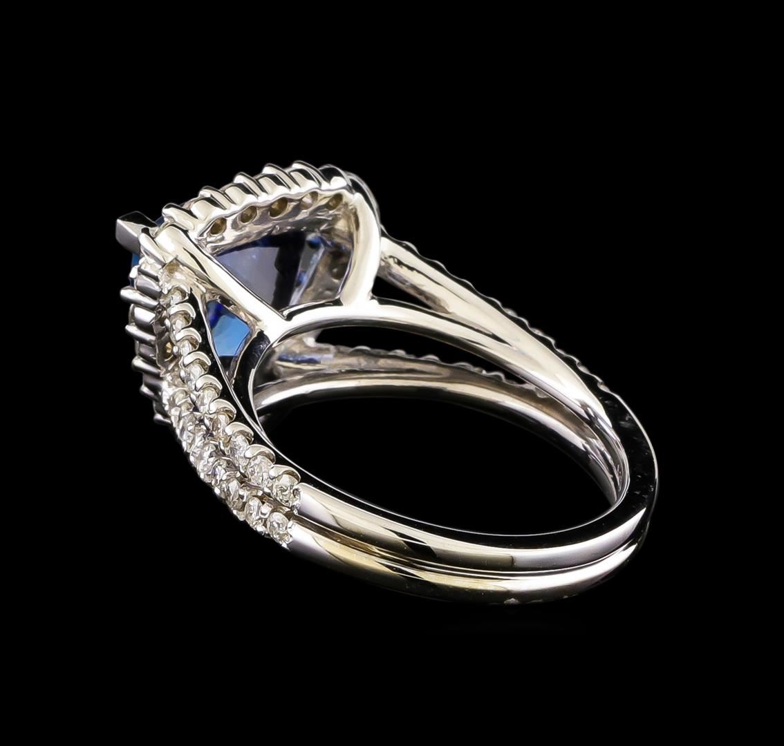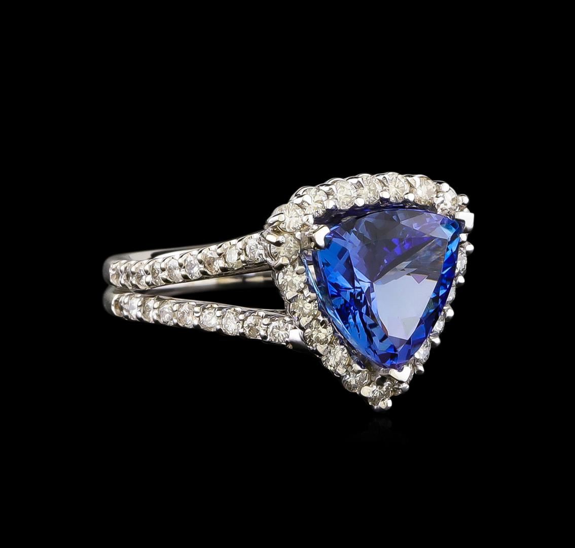 One electronically tested 14KT white gold ladies combination cast & assembled tanzanite and diamond ring with a split shoulder shank with a bright polish finish. Identified with markings of "14K". Condition is new. Containing: One prong set triangle modified brilliant cut natural tanzanite, measuring 9.73 x 9.57 x 5.82mm, approximate weight of 3.27ct., clarity is eye clean, type I, medium light, moderately strong, violet color, (GIA V 4/4), cut is good. Fifty-Six prong set round brilliant cut diamonds, measuring 1.50 - 1.50 x 0.90mm (depth est.) approximate total weight of 56 Stones = 0.69ct. Clarity: SI-2 to I-1. Color: I - J, Cut is Good. All diamonds and colored gemstones are graded in the mounting, unless otherwise stated. Colored gemstones are presumed to have been subjected to commonly used enhancement processes. Total Weight of Colored Stones 3.27ct. Total Weight of Diamonds 0.69ct. Total Weight of Ring 6.10 grams. GGL Appraised.