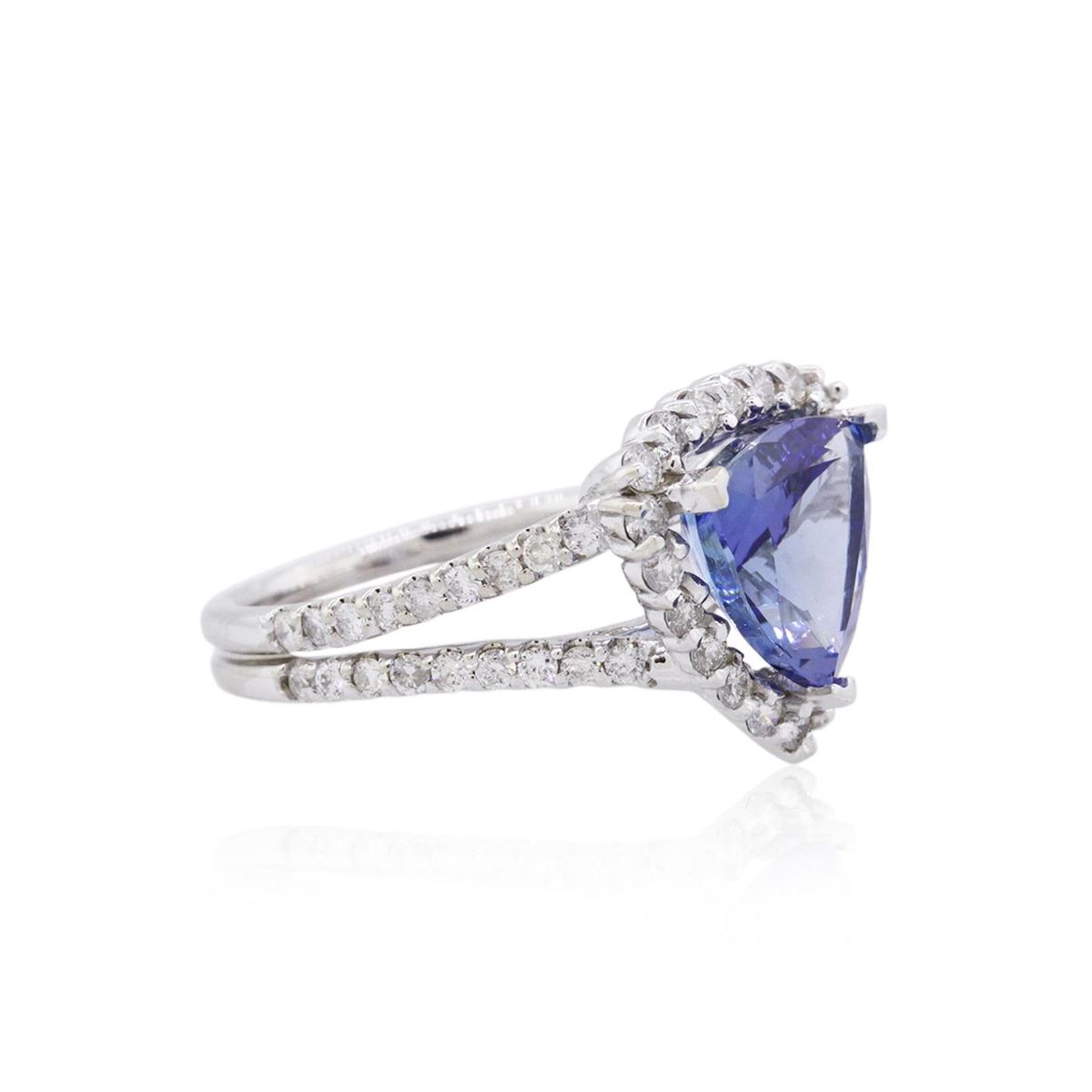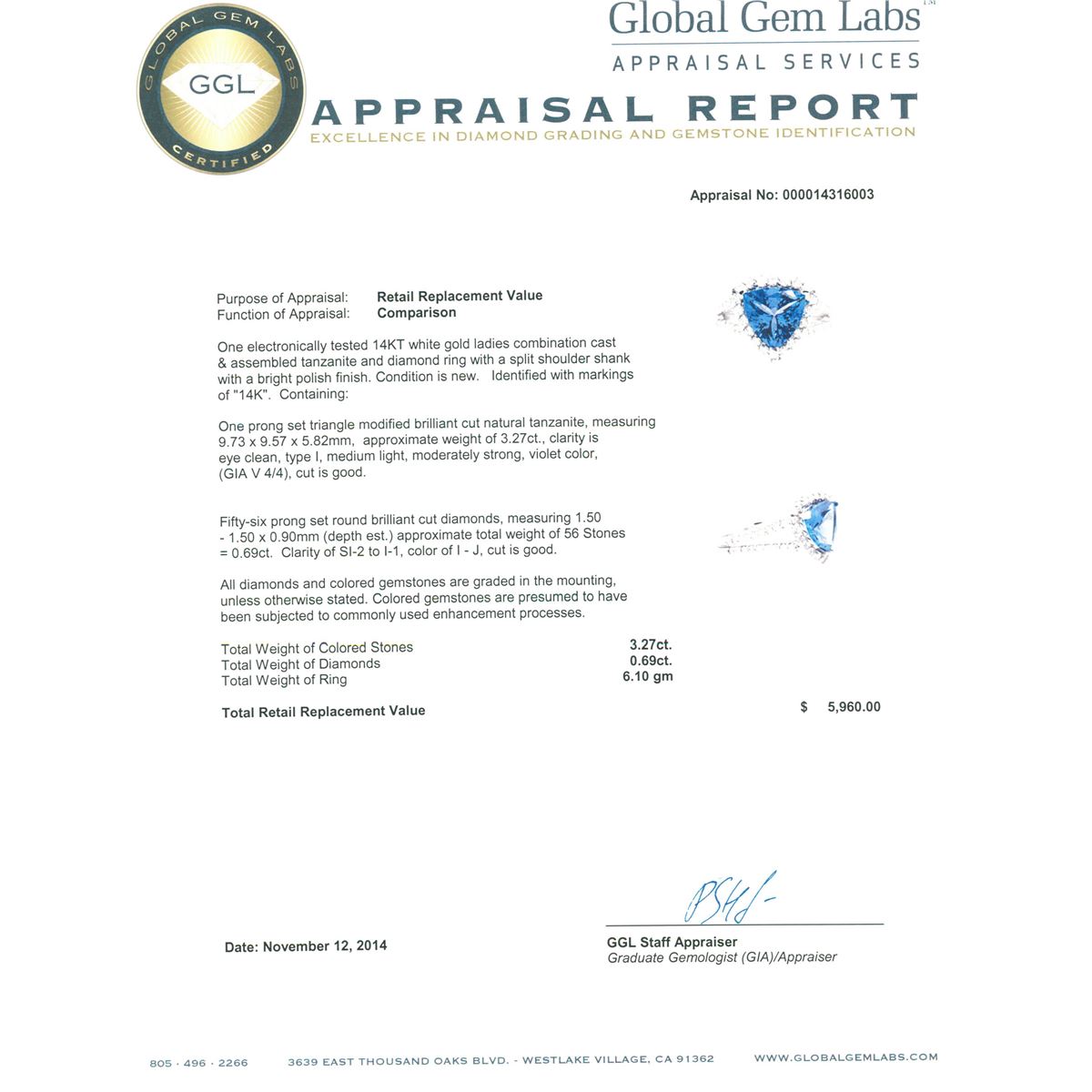 One electronically tested 14KT white gold ladies combination cast & assembled tanzanite and diamond ring with a split shoulder shank with a bright polish finish. Identified with markings of "14K". Condition is new. Containing: One prong set triangle modified brilliant cut natural tanzanite, measuring 9.73 x 9.57 x 5.82mm, approximate weight of 3.27ct., clarity is eye clean, type I, medium light, moderately strong, violet color, (GIA V 4/4), cut is good. Fifty-Six prong set round brilliant cut diamonds, measuring 1.50 - 1.50 x 0.90mm (depth est.) approximate total weight of 56 Stones = 0.69ct. Clarity: SI-2 to I-1. Color: I - J, Cut is Good. All diamonds and colored gemstones are graded in the mounting, unless otherwise stated. Colored gemstones are presumed to have been subjected to commonly used enhancement processes. Total Weight of Colored Stones 3.27ct. Total Weight of Diamonds 0.69ct. Total Weight of Ring 6.10 grams. GGL Appraised at $5,960.00.
