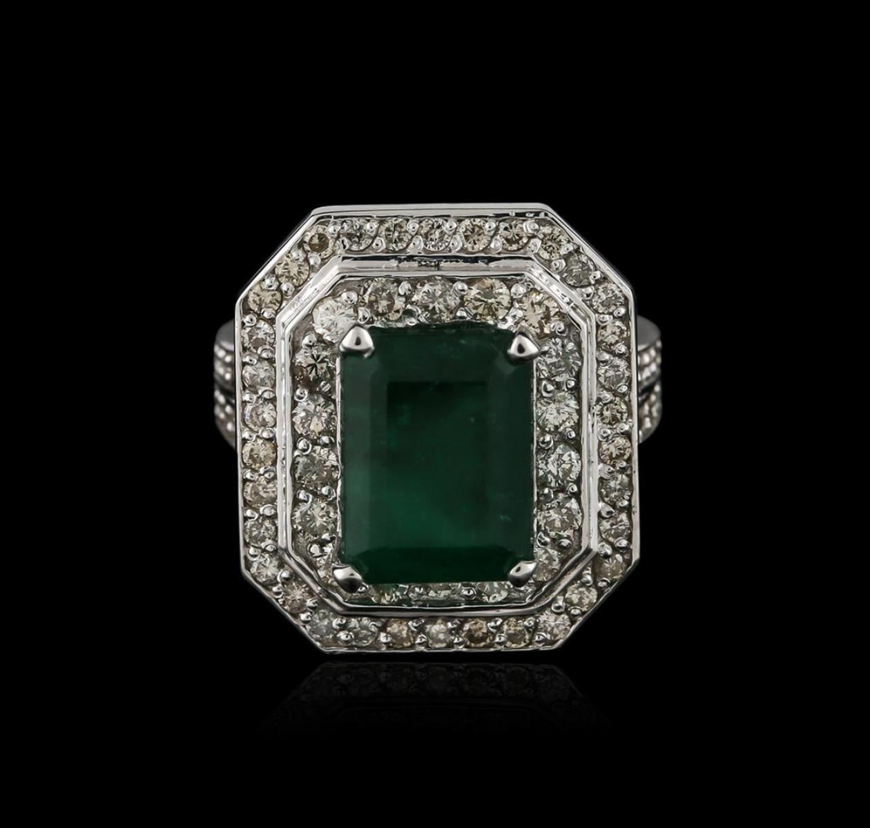 One electronically tested 14KT white gold ladies cast emerald and diamond ring with a bright polish finish. Identified with markings of "14K". Condition is new. Containing: One prong set oval emerald standard step cut natural emerald, measuring 11.82 x 6.10 x 6.20mm, approximate total weight of 3.28ct., clarity is heavily included, type III, medium dark, moderately strong, green color, (GIA G 6/4), cut is good. Seventy-Two prong set round brilliant cut diamonds, measuring 1.50 - 1.50 x 0.90mm (depth est.) approximate total weight of 72 Stones = 0.89ct. Clarity: I-1 to I-2. Color: I - J, Cut is Good. Diamonds and colored gemstones are graded in the mounting, unless otherwise stated. Colored gemstones are presumed to have been subjected to commonly used enhancement processes. Total Weight of Colored Stones 3.28ct. Total Weight of Diamonds 0.89ct. Total Weight of Ring 11.60 grams. GGL Appraised.
