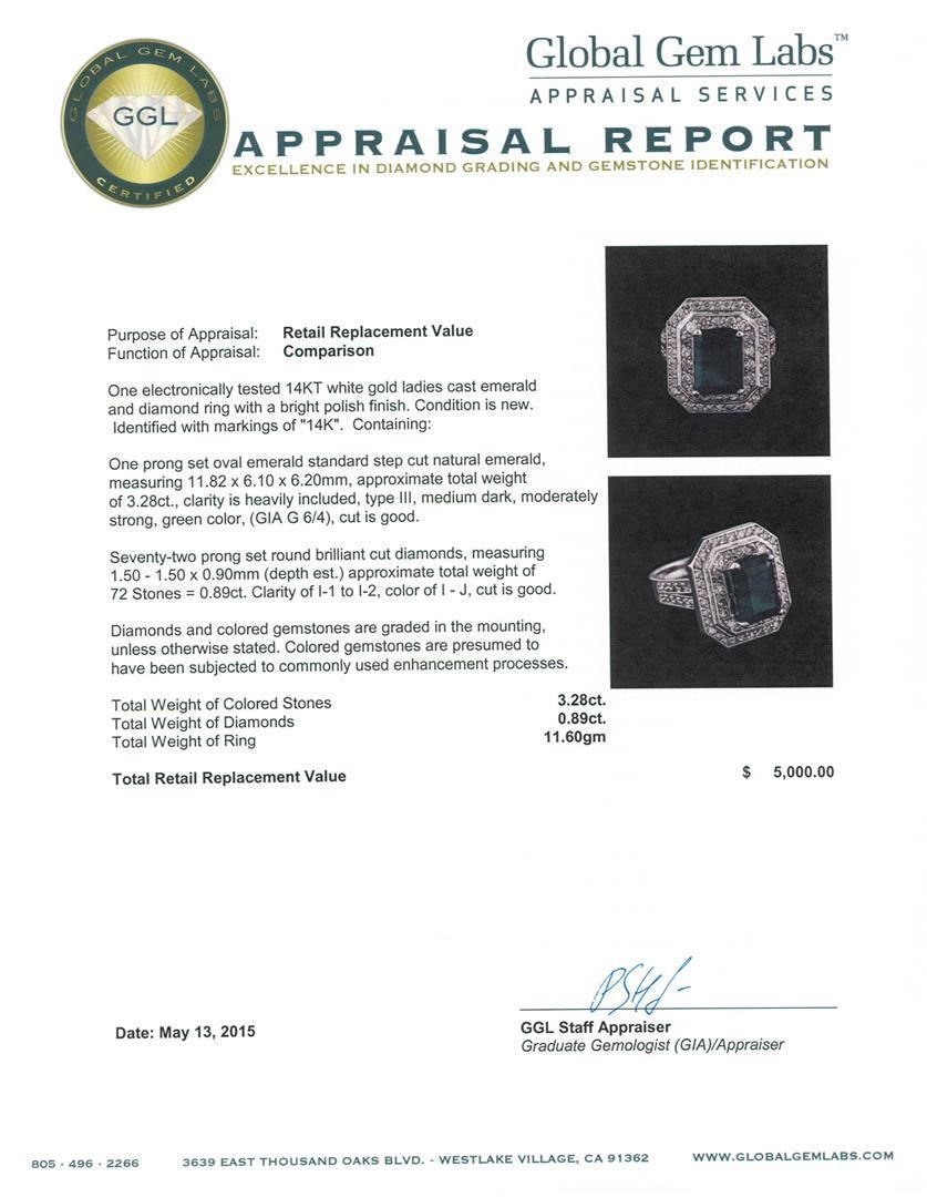One electronically tested 14KT white gold ladies cast emerald and diamond ring with a bright polish finish. Identified with markings of "14K". Condition is new. Containing: One prong set oval emerald standard step cut natural emerald, measuring 11.82 x 6.10 x 6.20mm, approximate total weight of 3.28ct., clarity is heavily included, type III, medium dark, moderately strong, green color, (GIA G 6/4), cut is good. Seventy-Two prong set round brilliant cut diamonds, measuring 1.50 - 1.50 x 0.90mm (depth est.) approximate total weight of 72 Stones = 0.89ct. Clarity: I-1 to I-2. Color: I - J, Cut is Good. Diamonds and colored gemstones are graded in the mounting, unless otherwise stated. Colored gemstones are presumed to have been subjected to commonly used enhancement processes. Total Weight of Colored Stones 3.28ct. Total Weight of Diamonds 0.89ct. Total Weight of Ring 11.60 grams. GGL Appraised.