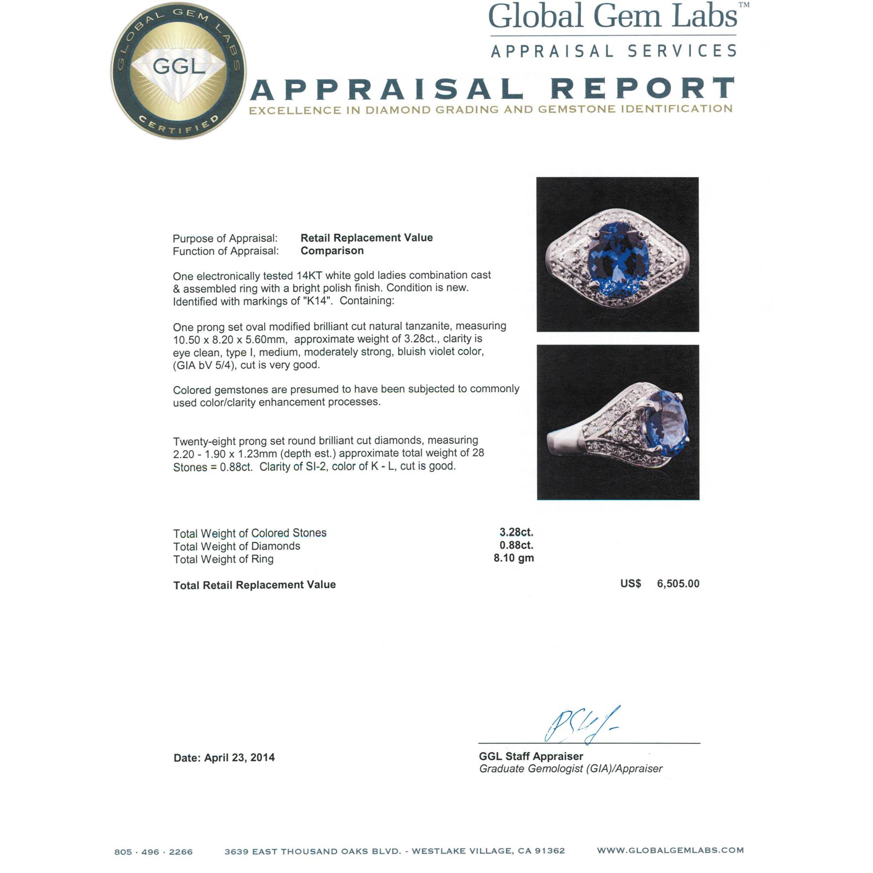 One electronically tested 14KT white gold Ladies combination cast & assembled ring with a bright polish finish. Condition is new. Identified with markings of "K14". Containing: One prong set oval modified brilliant cut natural tanzanite, measuring 10.50 x 8.20 x 5.60mm, approximate weight of 3.28ct., clarity is eye clean, type I, medium, moderately strong, bluish violet color, (GIA bV 5/4), cut is very good. Colored gemstones are presumed to have been subjected to commonly used color/clarity enhancement processes. Twenty-Eight prong set round brilliant cut diamonds, measuring 2.20 - 1.90 x 1.23mm (depth est.) approximate. Total Weight of 28 Stones = 0.88ct. Clarity: SI-2. Color: K - L, Cut is Good. Total Weight of Colored Stones 3.28ct. Total Weight of Diamonds 0.88ct. Total Weight of Ring 8.10 grams. GGL Appraised.