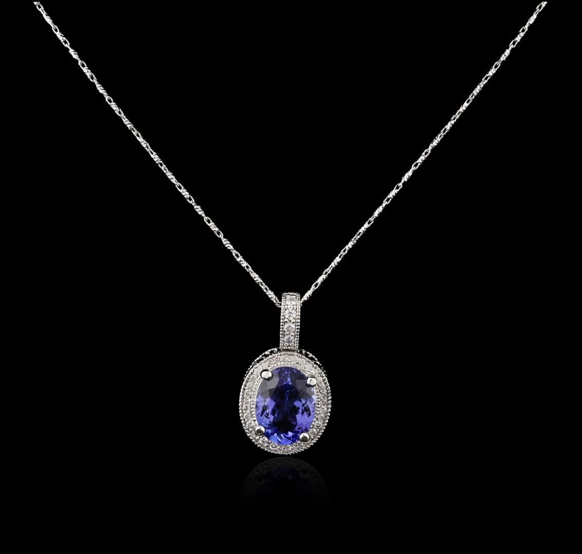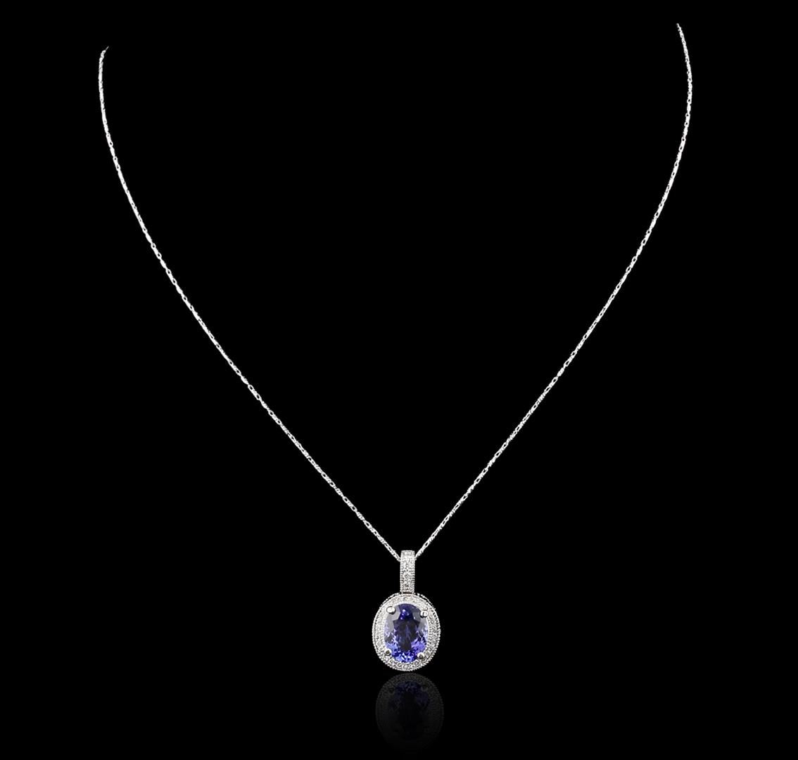 One electronically tested 14KT white gold ladies cast & assembled tanzanite and diamond pendant with chain. The pendant features a tanzanite set within a diamond bezel, completed by a diamond set bail. The pendant is supported by an eighteen inch length 14KT white gold designer style chain, terminating in a lobster claw clasp. Bright polish finish with milgrain detailing. Identified with markings of "14K". Condition is new, good workmanship. Containing: One prong set oval mixed cut natural tanzanite, measuring 11.10 x 8.26 x 4.95mm, 6% bulge factor, approximate weight of 3.29ct., clarity is eye clean, type I, medium dark, very slightly grayish, bluish violet color, (GIA bV 6/3), cut is good. Transmitting light with no distortion, transparent. Graded in the setting. Tanzanite is a very rare gemstone that is only found in the country of Tanzania. Originally discovered in 1967. Tiffany & Company, named the stone Tanzanite. It is found in the Usumburu Mountains that border the Umba Valley of northern Tanzania. Tanzanite occurs in gray, brown, violet, blue, reddish-purple, & green. The gem is interesting because of its exceptional pleochroism. Rotated in different directions a tanzanite will exhibit multiple changes of color. Tanzanite has a low tolerance to ultrasonic cleaning, and should not be cleaned using this method. Thirty-Four prong set round brilliant cut diamonds, measuring 1.70 - 1.20 x 0.87mm (depth est.) approximate total weight of 34 Stones = 0.35ct. Graded in the setting. Clarity: I-1 to I-3. Color: H - J. Total Weight of Colored Stones 3.29ct. Total Weight of Diamonds 0.35ct. Total Weight of Pendant With Chain 6.61 grams. AIG Appraised at $9,630.00.