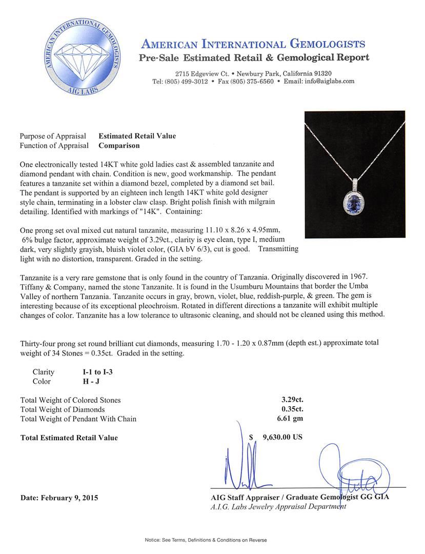 One electronically tested 14KT white gold ladies cast & assembled tanzanite and diamond pendant with chain. The pendant features a tanzanite set within a diamond bezel, completed by a diamond set bail. The pendant is supported by an eighteen inch length 14KT white gold designer style chain, terminating in a lobster claw clasp. Bright polish finish with milgrain detailing. Identified with markings of "14K". Condition is new, good workmanship. Containing: One prong set oval mixed cut natural tanzanite, measuring 11.10 x 8.26 x 4.95mm, 6% bulge factor, approximate weight of 3.29ct., clarity is eye clean, type I, medium dark, very slightly grayish, bluish violet color, (GIA bV 6/3), cut is good. Transmitting light with no distortion, transparent. Graded in the setting. Tanzanite is a very rare gemstone that is only found in the country of Tanzania. Originally discovered in 1967. Tiffany & Company, named the stone Tanzanite. It is found in the Usumburu Mountains that border the Umba Valley of northern Tanzania. Tanzanite occurs in gray, brown, violet, blue, reddish-purple, & green. The gem is interesting because of its exceptional pleochroism. Rotated in different directions a tanzanite will exhibit multiple changes of color. Tanzanite has a low tolerance to ultrasonic cleaning, and should not be cleaned using this method. Thirty-Four prong set round brilliant cut diamonds, measuring 1.70 - 1.20 x 0.87mm (depth est.) approximate total weight of 34 Stones = 0.35ct. Graded in the setting. Clarity: I-1 to I-3. Color: H - J. Total Weight of Colored Stones 3.29ct. Total Weight of Diamonds 0.35ct. Total Weight of Pendant With Chain 6.61 grams. AIG Appraised at $9,630.00.