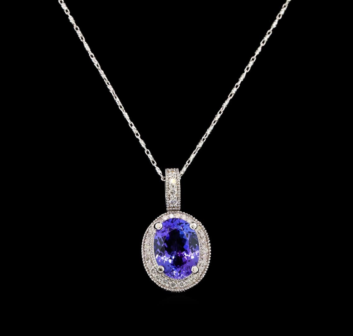 One electronically tested 14KT white gold ladies cast & assembled tanzanite and diamond pendant with chain. The pendant features a tanzanite set within a diamond bezel, completed by a diamond set bail. The pendant is supported by an eighteen inch length 14KT white gold designer style chain, terminating in a lobster claw clasp. Bright polish finish with milgrain detailing. Identified with markings of "14K". Condition is new, good workmanship. Containing: One prong set oval mixed cut natural tanzanite, measuring 11.10 x 8.26 x 4.95mm, 6% bulge factor, approximate weight of 3.29ct., clarity is eye clean, type I, medium dark, very slightly grayish, bluish violet color, (GIA bV 6/3), cut is good. Transmitting light with no distortion, transparent. Graded in the setting. Tanzanite is a very rare gemstone that is only found in the country of Tanzania. Originally discovered in 1967. Tiffany & Company, named the stone Tanzanite. It is found in the Usumburu Mountains that border the Umba Valley of northern Tanzania. Tanzanite occurs in gray, brown, violet, blue, reddish-purple, & green. The gem is interesting because of its exceptional pleochroism. Rotated in different directions a tanzanite will exhibit multiple changes of color. Tanzanite has a low tolerance to ultrasonic cleaning, and should not be cleaned using this method. Thirty-Four prong set round brilliant cut diamonds, measuring 1.70 - 1.20 x 0.87mm (depth est.) approximate total weight of 34 Stones = 0.35ct. Graded in the setting. Clarity: I-1 to I-3. Color: H - J. Total Weight of Colored Stones 3.29ct. Total Weight of Diamonds 0.35ct. Total Weight of Pendant With Chain 6.61 grams. AIG Appraised at $9,630.00.