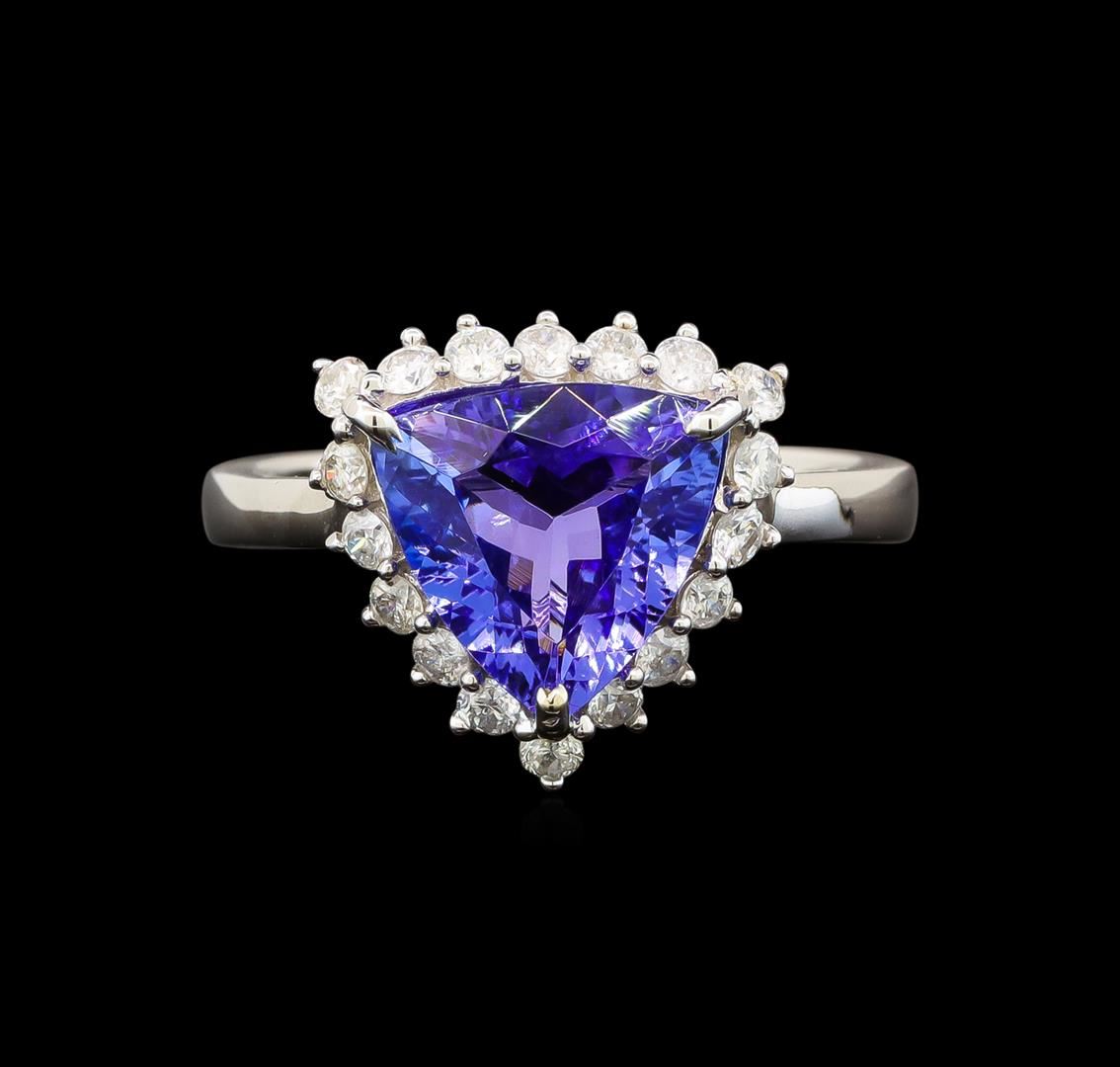 One electronically tested 14KT white gold ladies cast tanzanite and diamond ring with a flat shank with a bright polish finish. Trademark is Orianne. Identified with markings of "14K". Condition is new. Containing: One prong set triangle modified brilliant cut natural tanzanite, measuring 9.30 x 9.30 x 6.32mm, approximate weight of 3.30ct., clarity is eye clean, type I, medium light, very slightly grayish, violet color, (GIA V 4/3), cut is good. Eighteen prong set round brilliant cut diamonds, measuring 1.50 - 1.50 x 0.90mm (depth est.) approximate total weight of 18 Stones = 0.22ct. Clarity: SI-2 to I-2. Color: I - J, Cut is Good. All diamonds and colored gemstones are graded in the mounting, unless otherwise stated. Colored gemstones are presumed to have been subjected to commonly used enhancement processes.. Total Weight of Colored Stones 3.30ct. Total Weight of Diamonds 0.22ct. Total Weight of Ring 3.40 grams. GGL Appraised at $3,280.00.