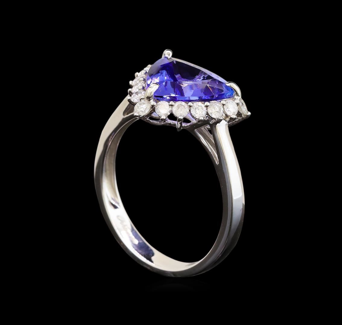 One electronically tested 14KT white gold ladies cast tanzanite and diamond ring with a flat shank with a bright polish finish. Trademark is Orianne. Identified with markings of "14K". Condition is new. Containing: One prong set triangle modified brilliant cut natural tanzanite, measuring 9.30 x 9.30 x 6.32mm, approximate weight of 3.30ct., clarity is eye clean, type I, medium light, very slightly grayish, violet color, (GIA V 4/3), cut is good. Eighteen prong set round brilliant cut diamonds, measuring 1.50 - 1.50 x 0.90mm (depth est.) approximate total weight of 18 Stones = 0.22ct. Clarity: SI-2 to I-2. Color: I - J, Cut is Good. All diamonds and colored gemstones are graded in the mounting, unless otherwise stated. Colored gemstones are presumed to have been subjected to commonly used enhancement processes.. Total Weight of Colored Stones 3.30ct. Total Weight of Diamonds 0.22ct. Total Weight of Ring 3.40 grams. GGL Appraised at $3,280.00.