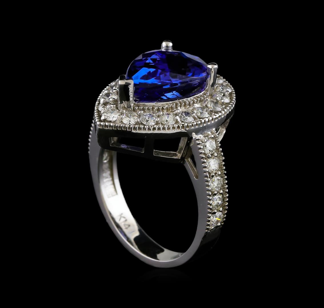 One electronically tested 14KT white gold ladies combination cast & assembled tanzanite and diamond ring with a flat shank with a bright polish finish. Identified with markings of "K14". Condition is new. Containing: One prong set pear modified brilliant cut natural tanzanite, measuring 12.00 x 8.71 x 4.71mm, approximate weight of 3.30ct., clarity is eye clean, type I, medium, moderately strong, violet color, (GIA V 5/4), cut is good. Twenty-Nine prong set round brilliant cut diamonds, measuring 2.00 - 2.00 x 1.20mm (depth est.) approximate total weight of 29 Stones = 0.85ct. Clarity: SI-2. Color: I - J, Cut is Good. Colored gemstones are presumed to have been subjected to commonly used enhancement processes. All diamonds and colored gemstones are graded in the mounting, unless otherwise stated. Total Weight of Colored Stones 3.30ct. Total Weight of Diamonds 0.85ct. Total Weight of Ring 7.20 grams. GGL Appraised at $6,740.00.