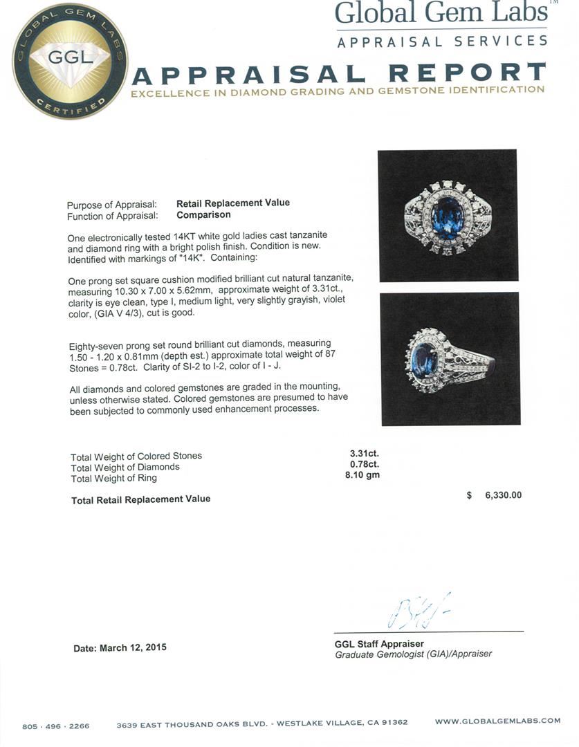 One electronically tested 14KT white gold ladies cast tanzanite and diamond ring with a bright polish finish. Identified with markings of "14K". Condition is new. Containing: One prong set square cushion modified brilliant cut natural tanzanite, measuring 10.30 x 7.00. x 5.62mm, approximate weight of 3.31ct., clarity is eye clean, type I, medium light, very slightly grayish, violet color, (GIA V 4/3), cut is good. Eighty-Seven prong set round brilliant cut diamonds, measuring 1.50 - 1.20 x 0.81mm (depth est.) approximate total weight of 87 Stones = 0.78ct. Clarity: SI-2 to I-2. Color: I - J. All diamonds and colored gemstones are graded in the mounting, unless otherwise stated. Colored gemstones are presumed to have been subjected to commonly used enhancement processes.. Total Weight of Colored Stones 3.31ct. Total Weight of Diamonds 0.78ct. Total Weight of Ring 8.10 grams. GGL Appraised at $6,330.00.
