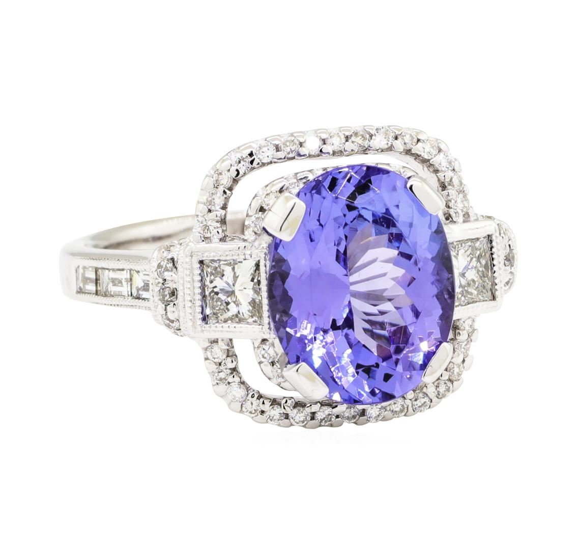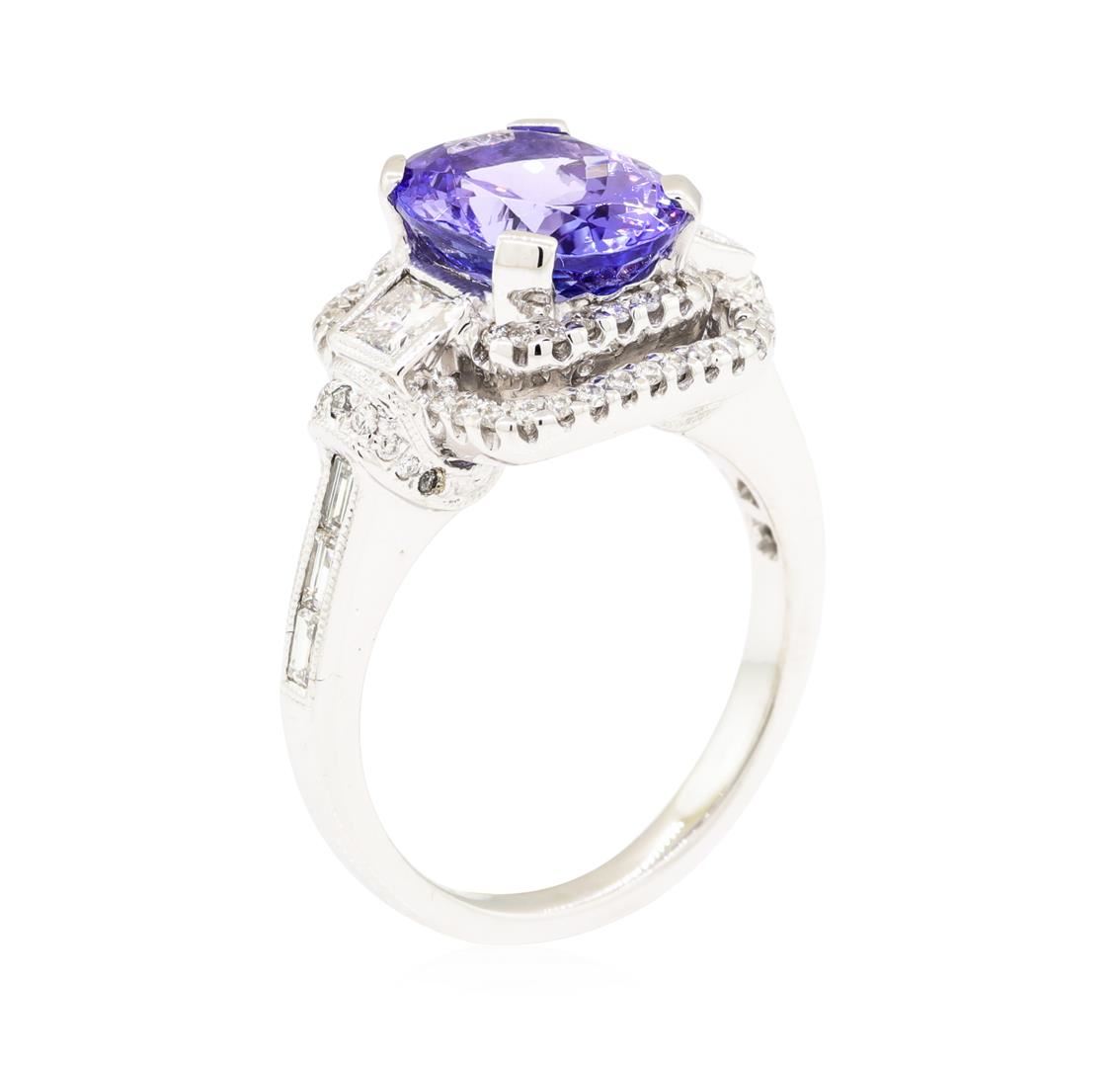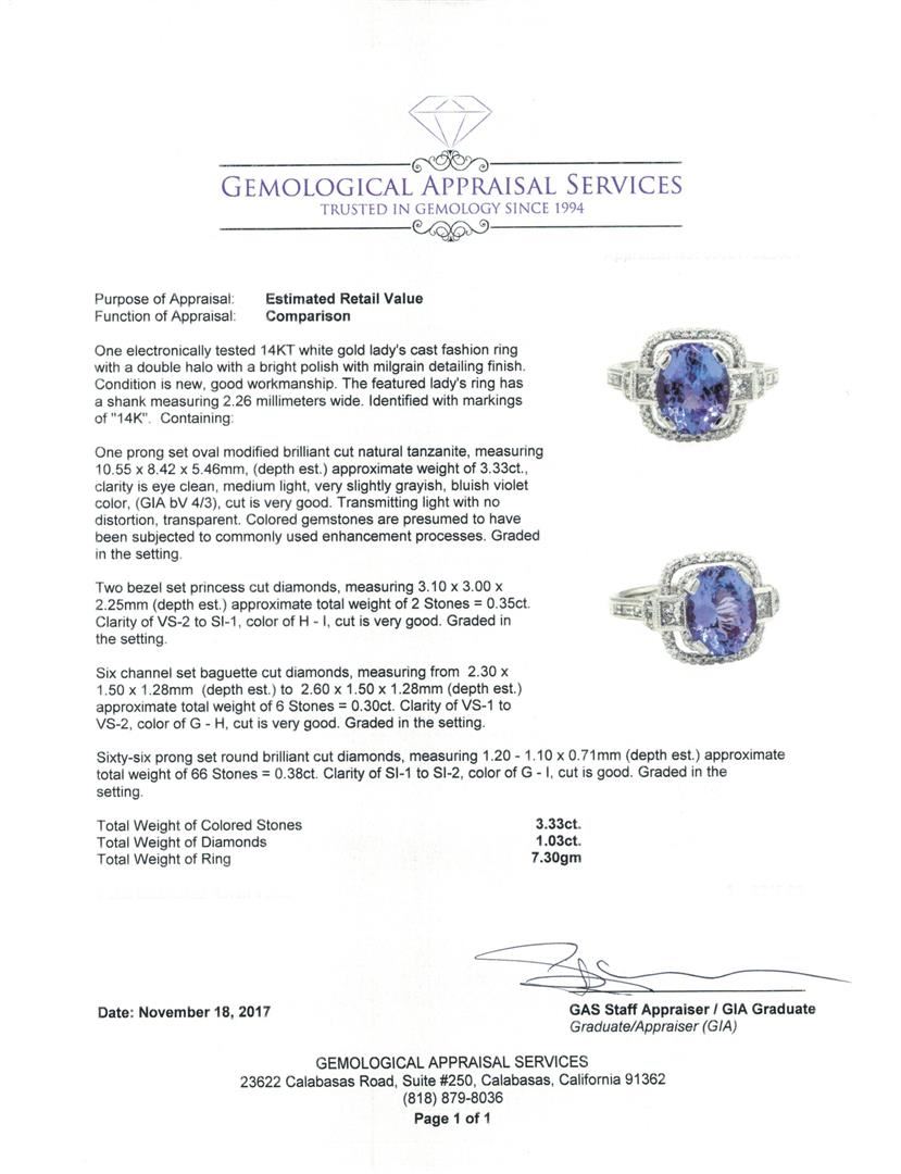 One electronically tested 14KT white gold lady's cast fashion ring with a double halo with a bright polish with milgrain detailing finish. The featured lady's ring has a shank measuring 2.26 millimeters wide. Identified with markings of '14K'. Condition is new, good workmanship. Containing: One prong set oval modified brilliant cut natural tanzanite, measuring 10.55 x 8.42 x 5.46mm, (depth est.) approximate weight of 3.33ct., clarity is eye clean, medium light, very slightly grayish, bluish violet color, (GIA bV 4/3), cut is very good. Transmitting light with no distortion, transparent. Colored gemstones are presumed to have been subjected to commonly used enhancement processes. Graded in the setting. Two bezel set princess cut diamonds, measuring 3.10 x 3.00 x 2.25mm (depth est.) approximate total weight of 2 Stones = 0.35ct. Graded in the setting. Color H - I Clarity VS-2 to SI-1 Cut Very Good Six channel set baguette cut diamonds, measuring from 2.30 x 1.50 x 1.28mm (depth est.) to 2.60 x 1.50 x 1.28mm (depth est.) approximate total weight of 6 Stones = 0.30ct. Graded in the setting. Color G - H Clarity VS-1 to VS-2 Cut Very Good Sixty-Six prong set round brilliant cut diamonds, measuring 1.20 - 1.10 x 0.71mm (depth est.) approximate total weight of 66 Stones = 0.38ct. Graded in the setting. Color G - I Clarity SI-1 to SI-2 Cut Good. Total Weight of Colored Stones 3.33ct.. Total Weight of Diamonds 1.03ct.. Total Weight of Ring 7.30gm. GAS Appraised.