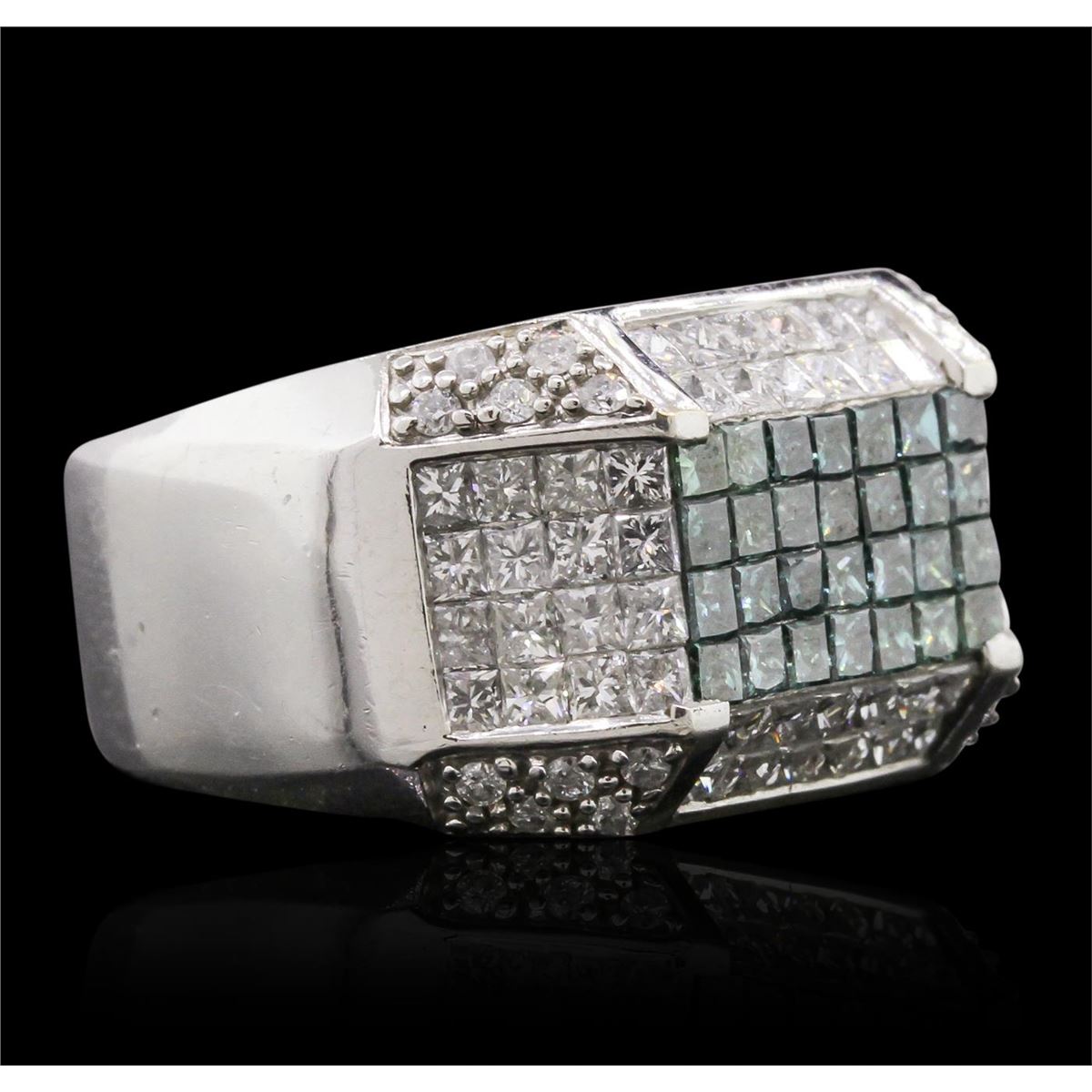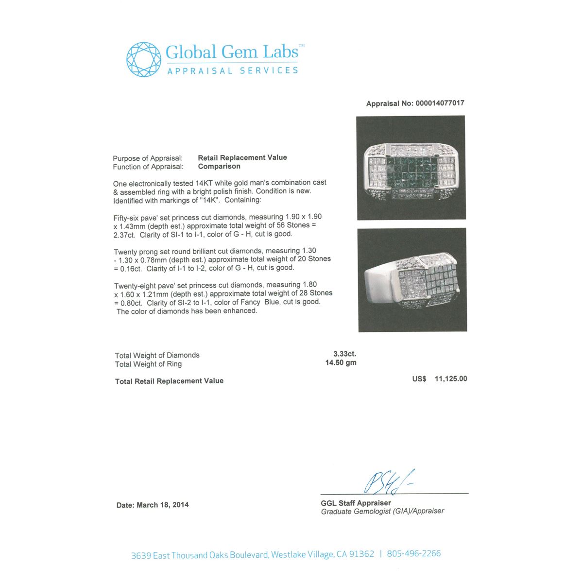One electronically tested 14KT white gold man's combination cast & assembled ring with a bright polish finish. Condition is new. Identified with markings of "14K". Containing: Fifty-Six pave' set princess cut diamonds, measuring 1.90 x 1.90 x 1.43mm (depth est.) approximate. Total Weight of 56 Stones = 2.37ct. Clarity: SI-1 to I-1. Color: G - H, Cut is Good. Twenty prong set round brilliant cut diamonds, measuring 1.30 - 1.30 x 0.78mm (depth est.) approximate. Total Weight of 20 Stones = 0.16ct. Clarity: I-1 to I-2. Color: G - H, Cut is Good. Twenty-Eight pave' set princess cut diamonds, measuring 1.80 x 1.60 x 1.21mm (depth est.) approximate. Total Weight of 28 Stones = 0.80ct. Clarity: SI-2 to I-1, Cut is Good. The color of diamonds has been enhanced. Total Weight of Diamonds 3.33ct. Total Weight of Ring 14.50gm. GGL Appraised at $11,125.00.