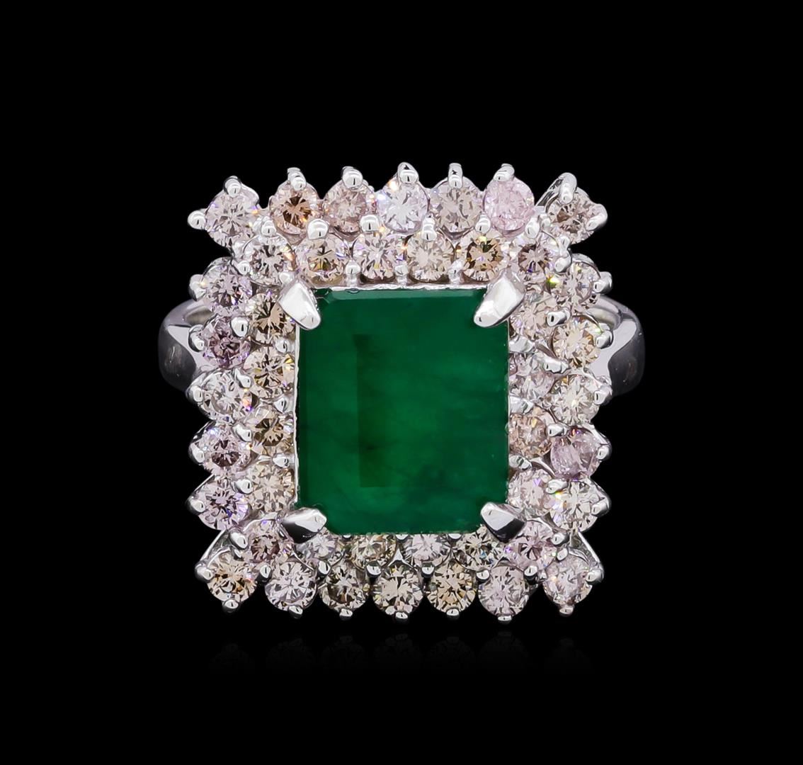 One electronically tested 14KT white gold ladies cast emerald and diamond ring with a bright polish finish. Condition is good. The featured emerald is set within a two tiered diamond lattice gallery, completed by a three millimeter wide band. Identified with markings of "K14". Containing: One prong set rectangular step cut natural emerald, measuring 9.80 x 8.25 x 4.80mm, approximate weight of 3.34ct., clarity is severely included, type III, medium dark, very slightly grayish, very slightly bluish green color, (GIA vslbG 6/3), cut is good. Transmitting light somewhat diffusely, translucent to opaque. Naturally occurring internal & external characteristics are present. Indications of oil residue. Graded in the setting. Forty-four prong set round brilliant cut diamonds, measuring 2.10 - 2.00 x 1.23mm (depth est.) approximate total weight of 44 Stones = 1.68ct. Graded in the setting. Clarity SI-1 to I-1. Color Very Light Brown. Total Weight of Colored Stones 3.34ct. Total Weight of Diamonds 1.68ct. Total Weight of Ring 7.80gm. AIG Appraised at $7,260.00.