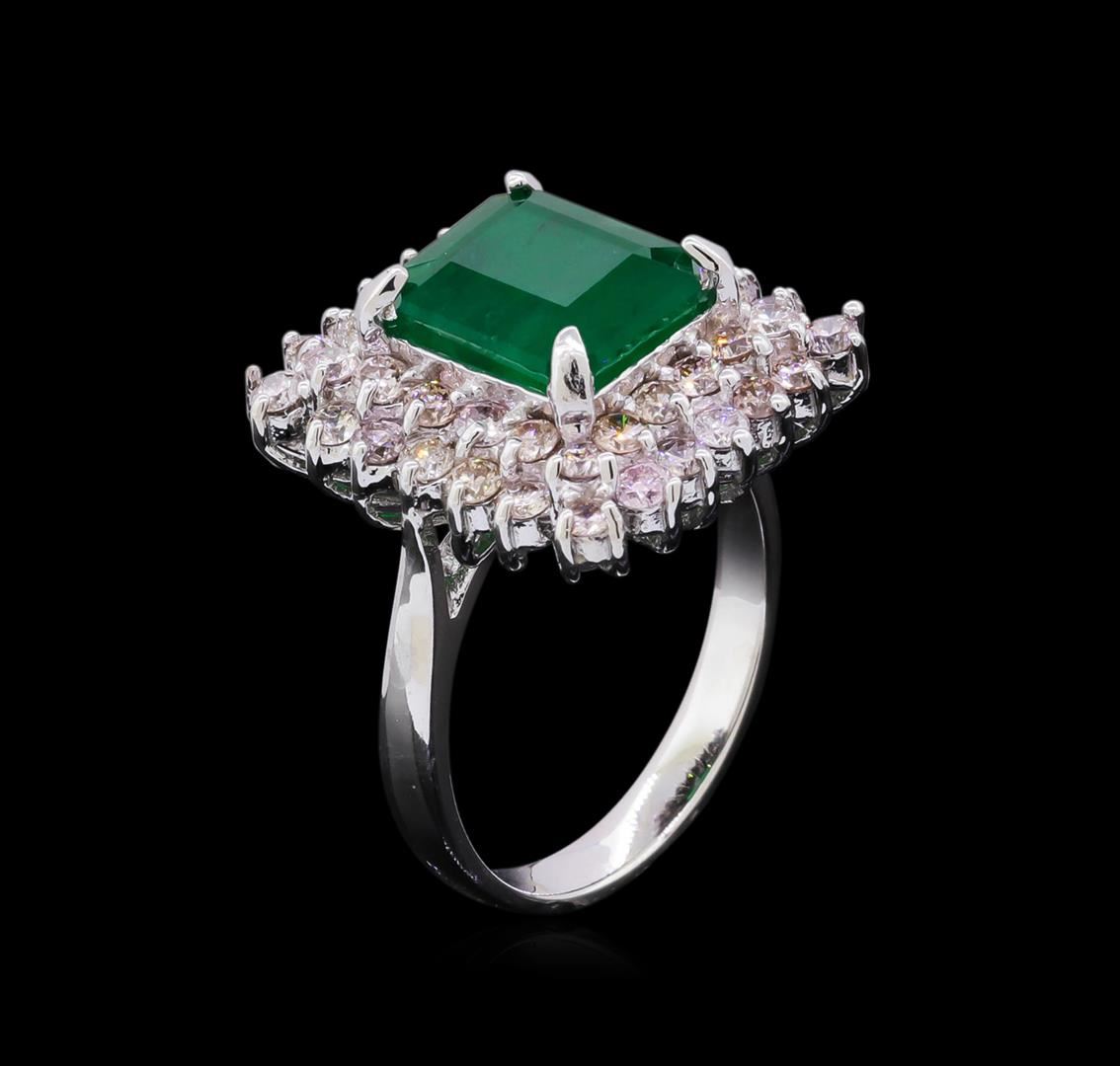 One electronically tested 14KT white gold ladies cast emerald and diamond ring with a bright polish finish. Condition is good. The featured emerald is set within a two tiered diamond lattice gallery, completed by a three millimeter wide band. Identified with markings of "K14". Containing: One prong set rectangular step cut natural emerald, measuring 9.80 x 8.25 x 4.80mm, approximate weight of 3.34ct., clarity is severely included, type III, medium dark, very slightly grayish, very slightly bluish green color, (GIA vslbG 6/3), cut is good. Transmitting light somewhat diffusely, translucent to opaque. Naturally occurring internal & external characteristics are present. Indications of oil residue. Graded in the setting. Forty-four prong set round brilliant cut diamonds, measuring 2.10 - 2.00 x 1.23mm (depth est.) approximate total weight of 44 Stones = 1.68ct. Graded in the setting. Clarity SI-1 to I-1. Color Very Light Brown. Total Weight of Colored Stones 3.34ct. Total Weight of Diamonds 1.68ct. Total Weight of Ring 7.80gm. AIG Appraised at $7,260.00.