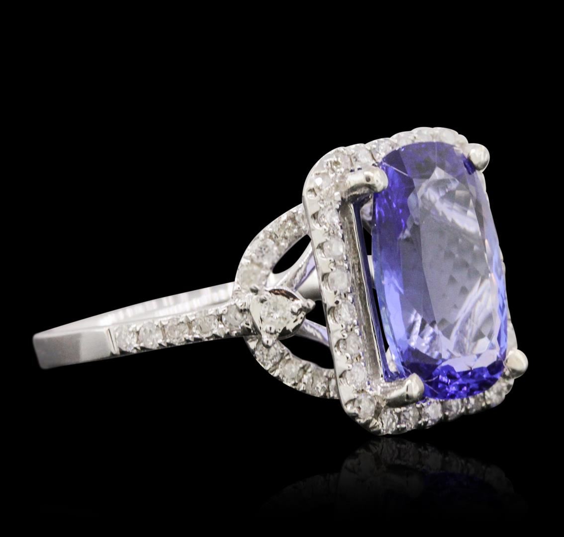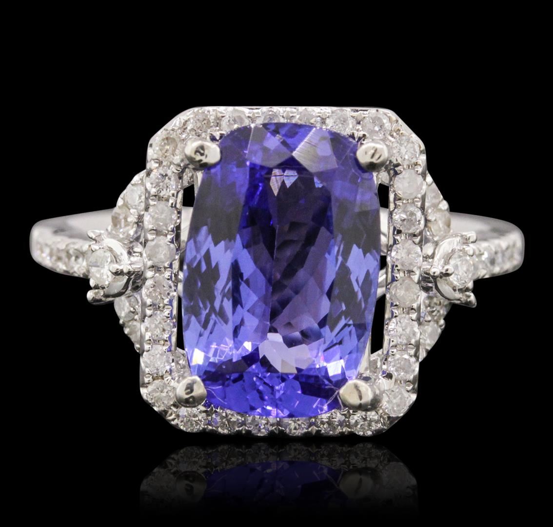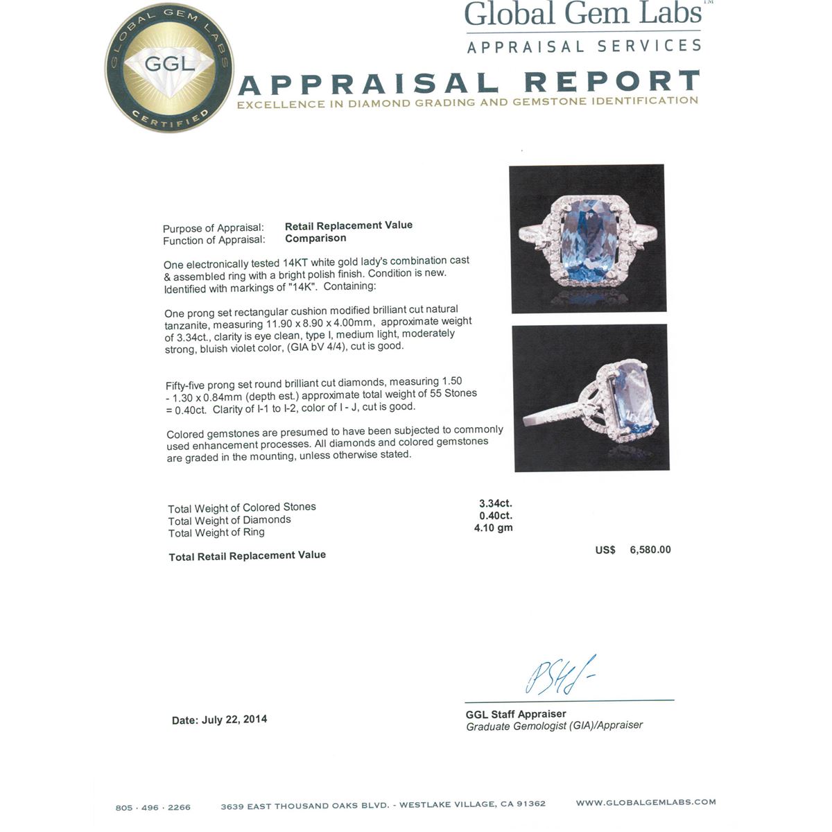 One electronically tested 14KT white gold ladies combination cast & assembled ring with a bright polish finish. Condition is new. Identified with markings of "14K". Containing: One prong set rectangular cushion modified brilliant cut natural tanzanite, measuring 11.90 x 8.90 x 4.00mm, approximate weight of 3.34ct., clarity is eye clean, type I, medium light, moderately strong, bluish violet color, (GIA bV 4/4), cut is good. Fifty-Five prong set round brilliant cut diamonds, measuring 1.50 - 1.30 x 0.84mm (depth est.) approximate total weight of 55 Stones = 0.40ct. Clarity: I-1 to I-2. Color: I - J, Cut is Good. Colored gemstones are presumed to have been subjected to commonly used enhancement processes. All diamonds and colored gemstones are graded in the mounting, unless otherwise stated. Total Weight of Colored Stones 3.34ct. Total Weight of Diamonds 0.40ct. Total Weight of Ring 4.10 grams. GGL Appraised at $6,580.00.