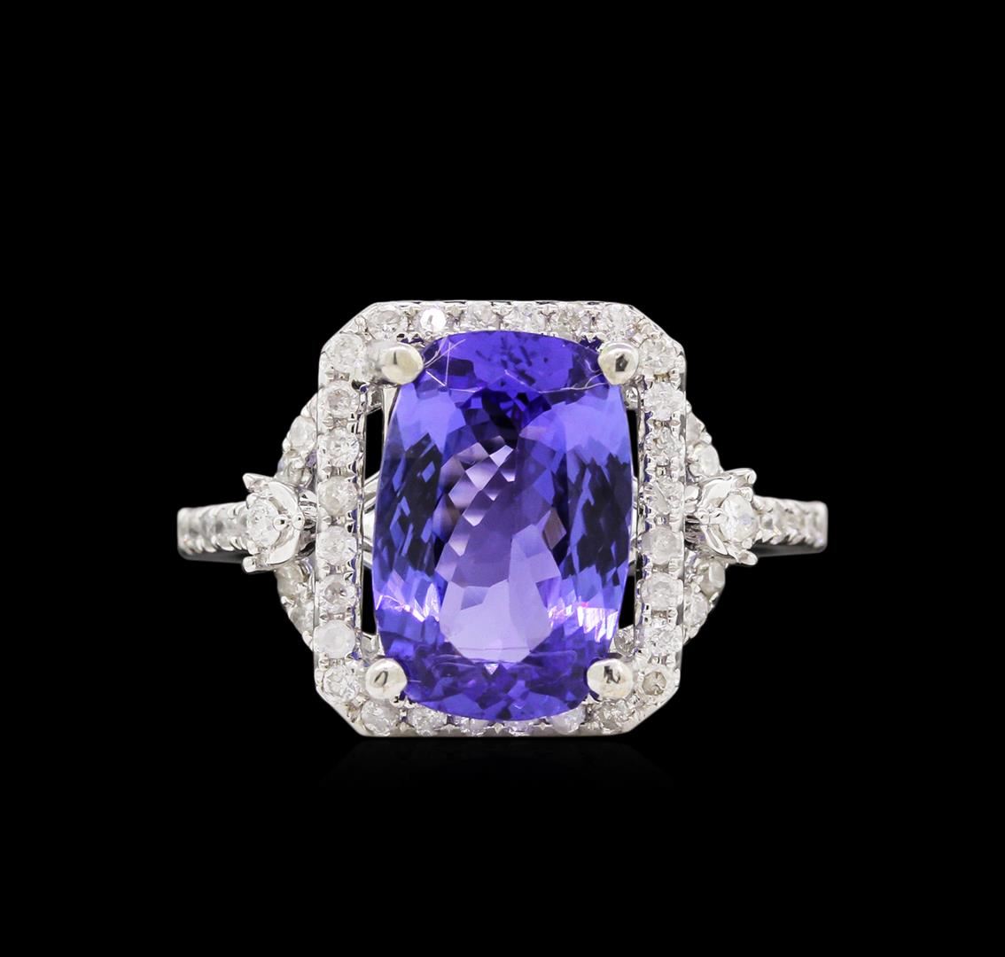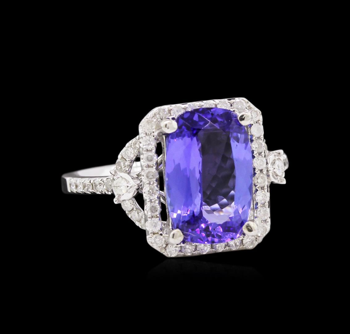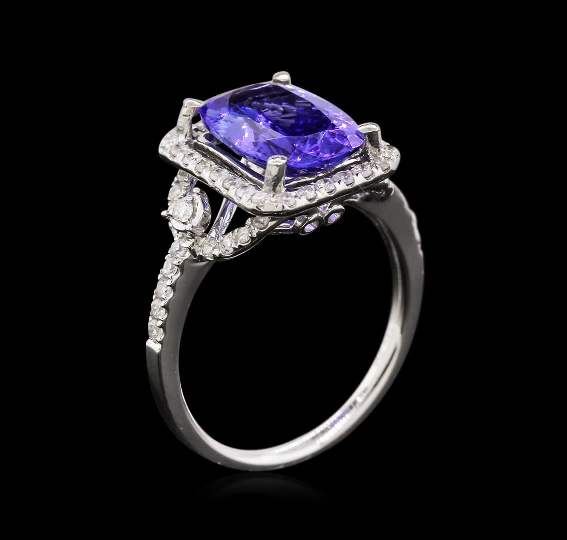 One electronically tested 14KT white gold ladies combination cast & assembled ring with a bright polish finish. Condition is new. Identified with markings of "14K". Containing: One prong set rectangular cushion modified brilliant cut natural tanzanite, measuring 11.90 x 8.90 x 4.00mm, approximate weight of 3.34ct., clarity is eye clean, type I, medium light, moderately strong, bluish violet color, (GIA bV 4/4), cut is good. Fifty-Five prong set round brilliant cut diamonds, measuring 1.50 - 1.30 x 0.84mm (depth est.) approximate total weight of 55 Stones = 0.40ct. Clarity: I-1 to I-2. Color: I - J, Cut is Good. Colored gemstones are presumed to have been subjected to commonly used enhancement processes. All diamonds and colored gemstones are graded in the mounting, unless otherwise stated. Total Weight of Colored Stones 3.34ct. Total Weight of Diamonds 0.40ct. Total Weight of Ring 4.10 grams. GGL Appraised at $6,580.00.