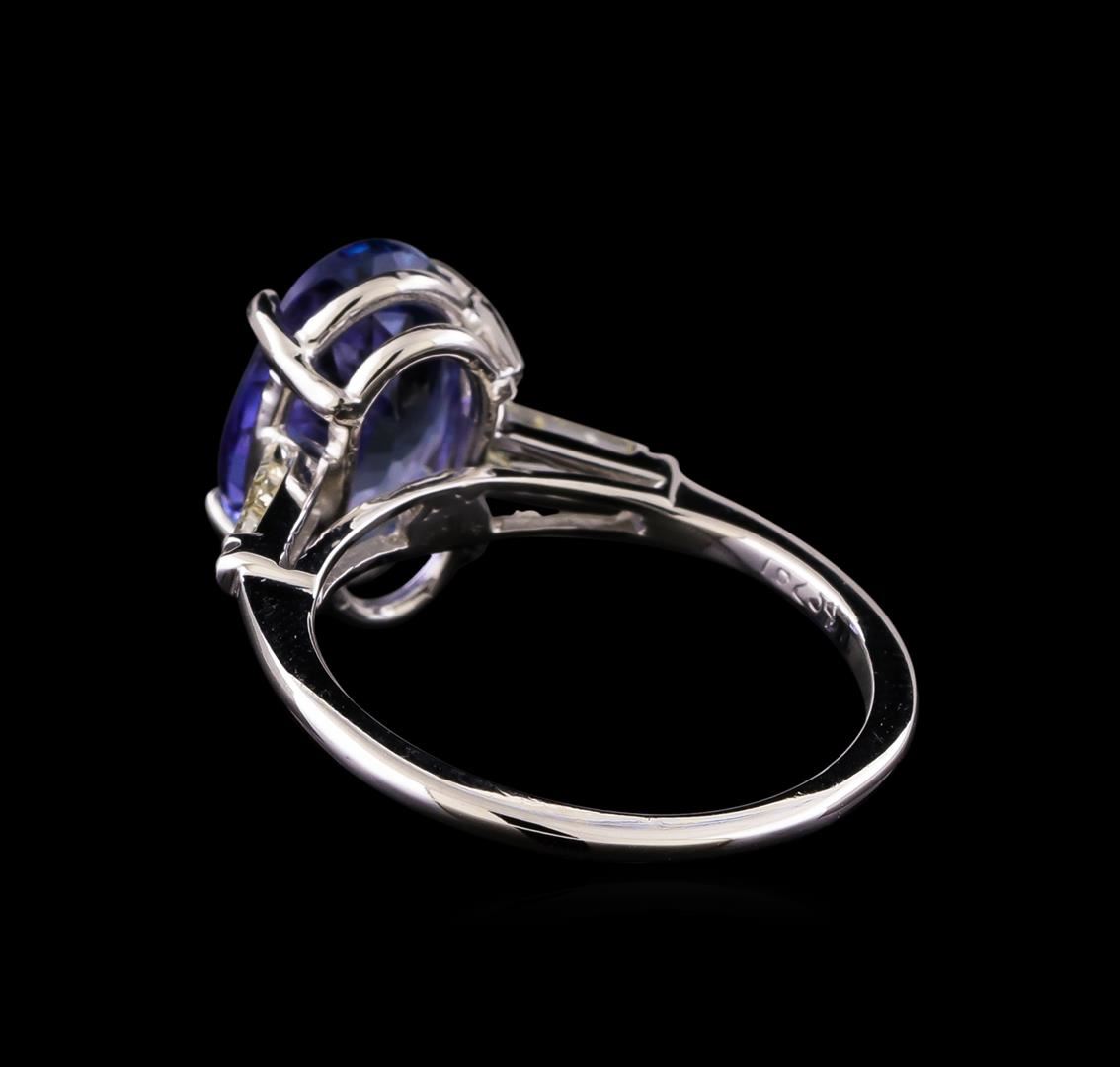 One electronically tested 14KT white gold ladies combination cast & assembled tanzanite and diamond ring with a flat shank with a bright polish finish. Condition is new. Containing: One prong set oval modified brilliant cut natural tanzanite, measuring 11.45 x 8.07 x 5.25mm, approximate weight of 3.35ct., clarity is eye clean, type I, medium light, very slightly grayish, violet color, (GIA V 4/3), cut is good. Two prong set baguette cut (tapered) diamonds, measuring 6.70 x 2.00 x 1.70mm (depth est.) approximate total weight of 2 Stones = 0.42ct. Clarity: SI-1. Color: I, Cut is Good. Colored gemstones are presumed to have been subjected to commonly used enhancement processes. All diamonds and colored gemstones are graded in the mounting, unless otherwise stated. Total Weight of Colored Stones 3.35ct. Total Weight of Diamonds 0.42ct. Total Weight of Ring 3.10 grams. GGL Appraised.
