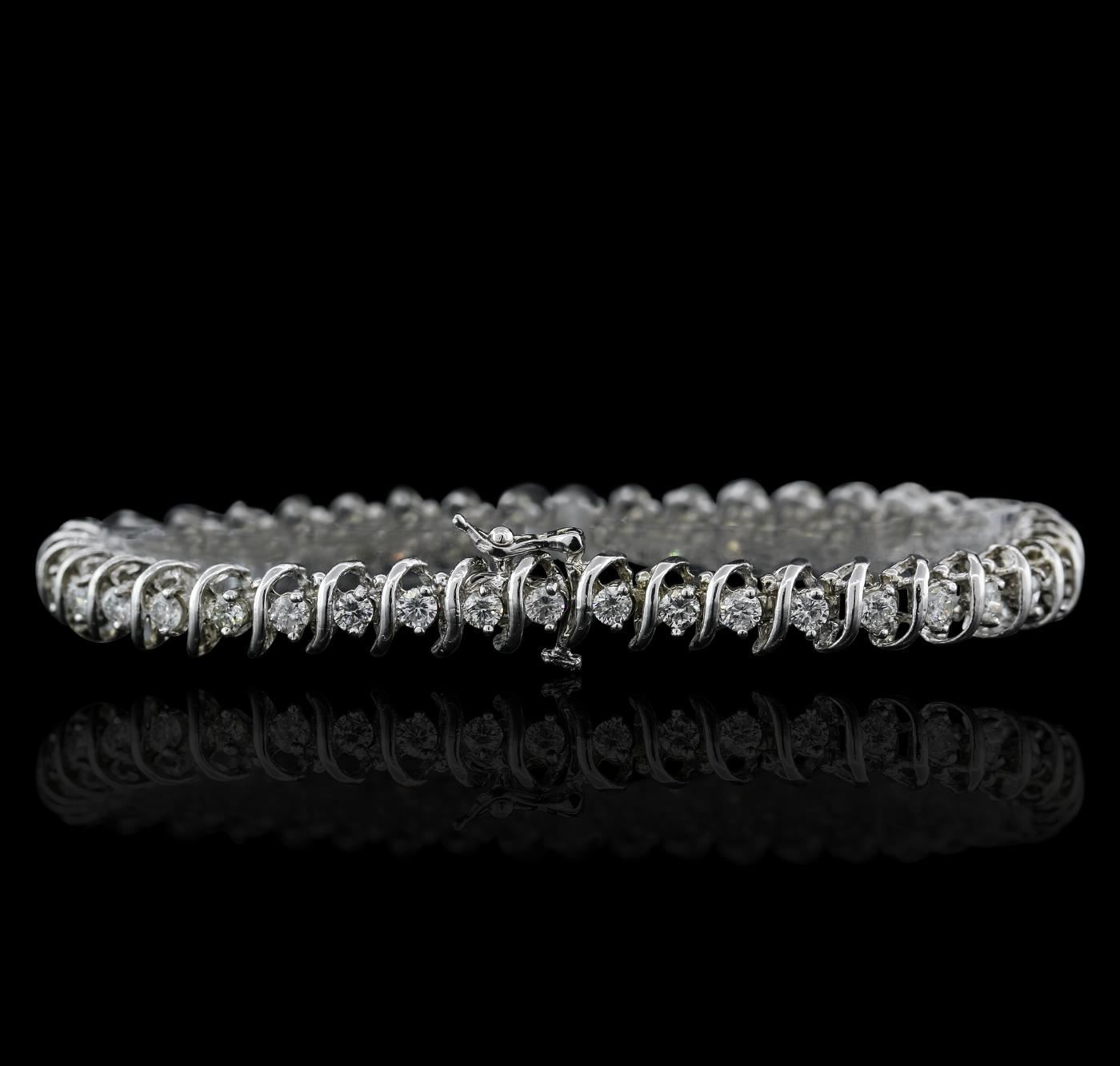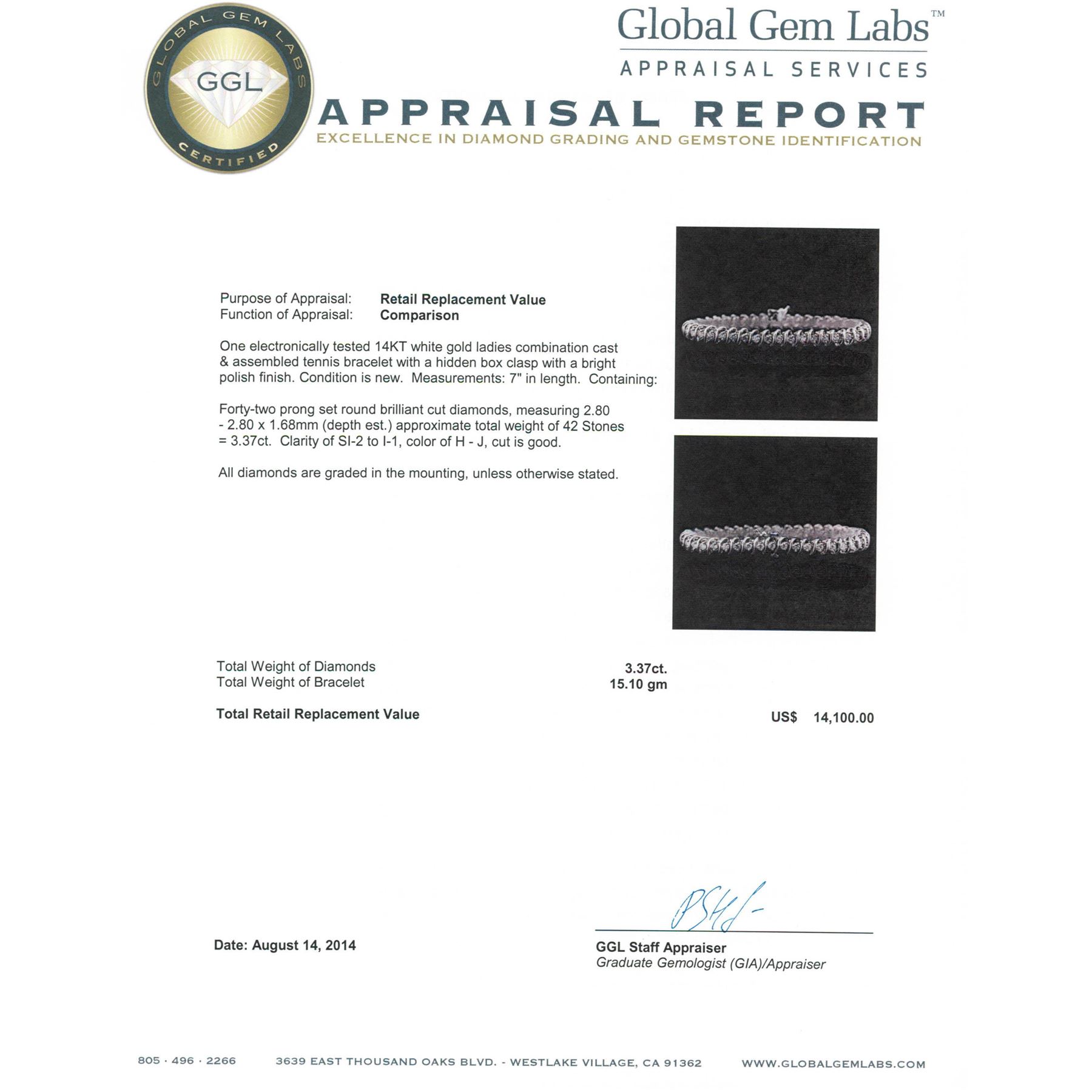 One electronically tested 14KT white gold ladies combination cast & assembled tennis bracelet with a hidden box clasp with a bright polish finish. Condition is new. Measurements: 7" in length. Containing: Forty-Two prong set round brilliant cut diamonds, measuring 2.80 - 2.80 x 1.68mm (depth est.) approximate total weight of 42 Stones = 3.37ct. Clarity: SI-2 to I-1. Color: H - J, Cut is Good. All diamonds are graded in the mounting, unless otherwise stated. Total Weight of Diamonds 3.37ct. Total Weight of Bracelet 15.10 grams. GGL Appraised.