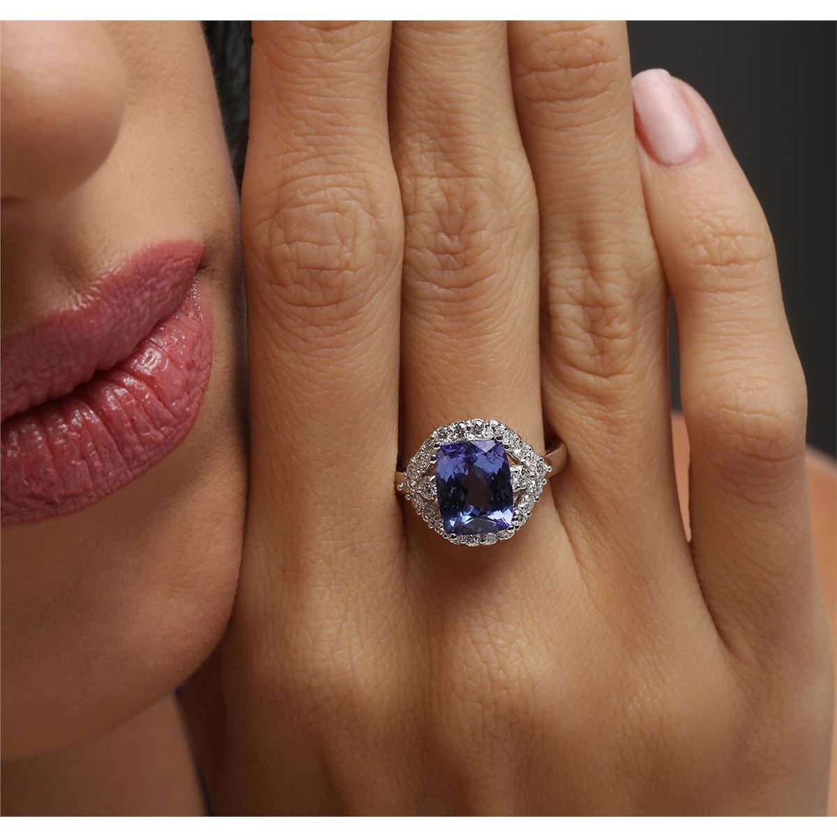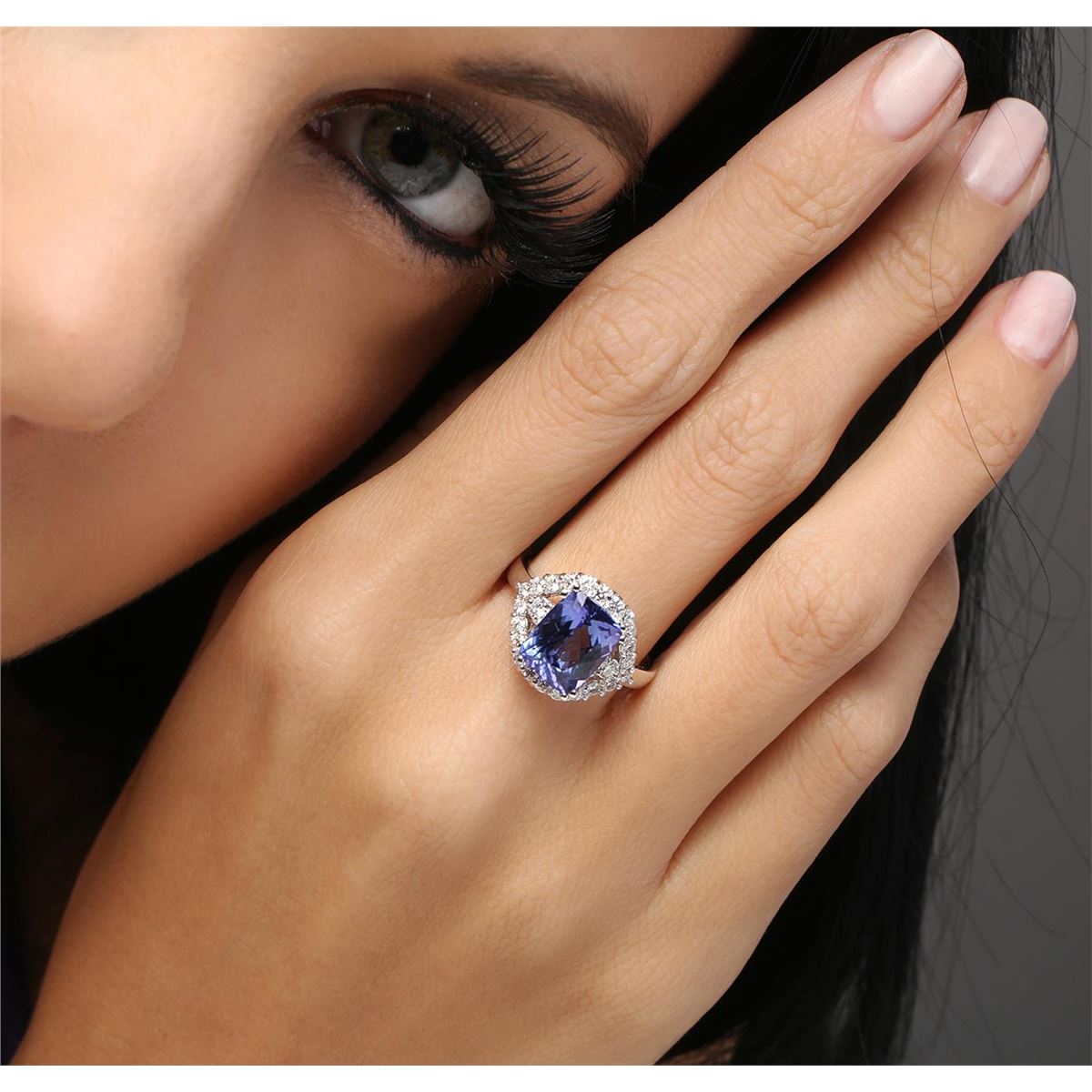 One electronically tested 14KT white gold ladies cast tanzanite & diamond ring with a bright finish. The featured tanzanite is set within a diamond bezel, supported by a ribbed under gallery, completed by a two and one half millimeter wide band. Identified with markings of "K14". Condition is new, good workmanship. Containing: One prong set rectangular cushion brilliant cut natural tanzanite, measuring 10.00 x 8.00 x 5.15mm, 4% bulge factor, approximate weight of 3.37ct., clarity is slightly included, type I, medium dark, slightly grayish, bluish violet color, (GIA bV 6/2), cut is good. Transmitting light with no distortion, transparent. Graded in the setting. Tanzanite is a very rare gemstone that is only found in the country of Tanzania. Originally discovered in 1967. Tiffany & Company, named the stone Tanzanite. It is found in the Usumburu Mountains that border the Umba Valley of northern Tanzania. Tanzanite occurs in gray, brown, violet, blue, reddish-purple, & green. The gem is interesting because of its exceptional pleochroism. Rotated in different directions a tanzanite will exhibit multiple changes of color. Tanzanite has a low tolerance to ultrasonic cleaning, and should not be cleaned using this method. Twenty-Four prong set round brilliant cut diamonds, measuring 2.30 - 1.80 x 1.23mm (depth est.) approximate total weight of 24 Stones = 0.64ct. Graded in the setting. Clarity: SI-2 to I-1. Color: G - I. Total Weight of Colored Stones 3.37ct. Total Weight of Diamonds 0.64ct. Total Weight of Ring 5.45 grams. AIG Appraised at $8,780.00.