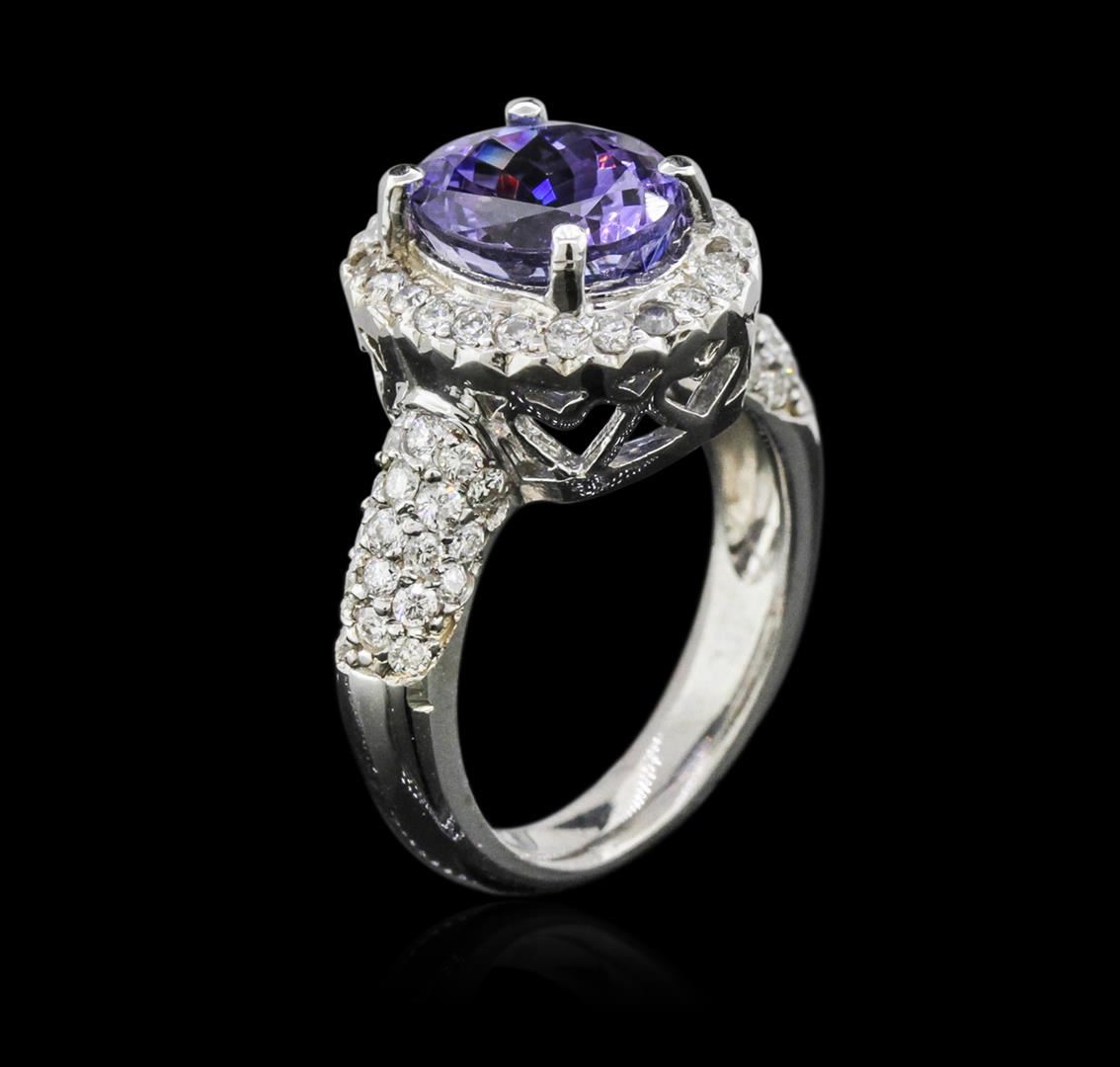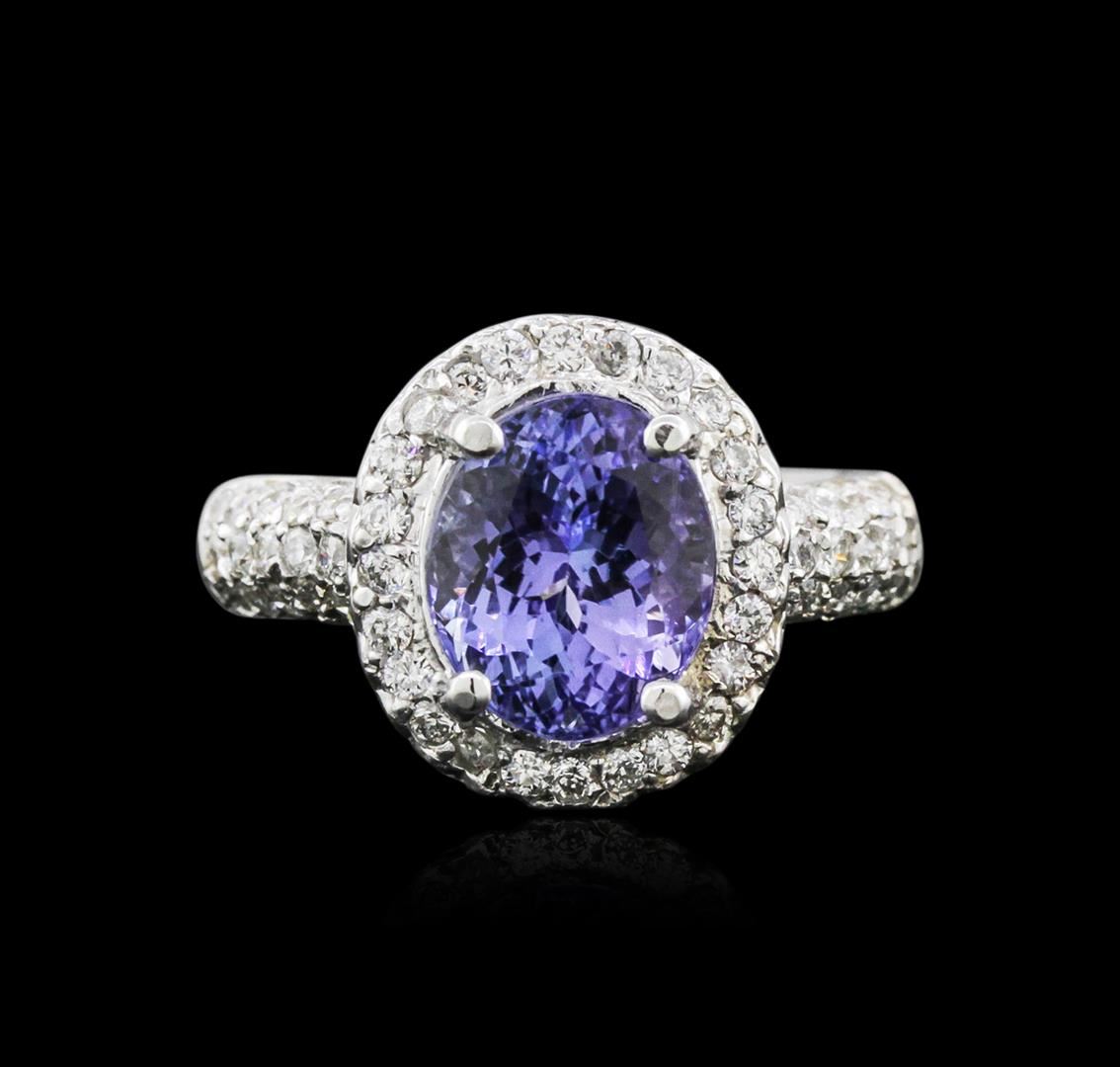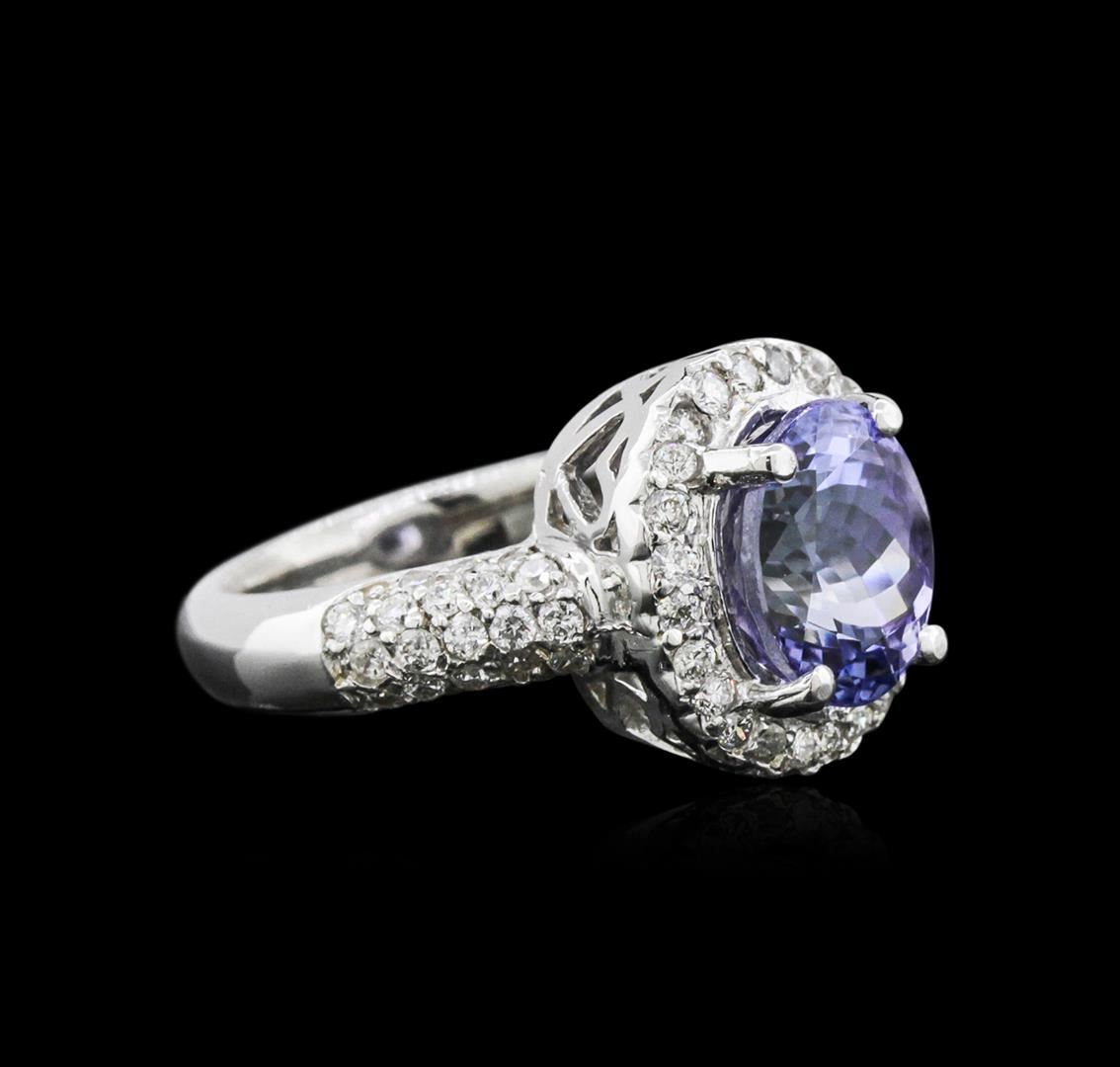 One electronically tested 14KT white gold ladies cast tanzanite and diamond ring with a bright polish finish. Condition is new. Containing: One prong set oval modified brilliant cut natural tanzanite, measuring 10.20 x 8.50 x 5.53mm, approximate weight of 3.37ct., clarity is eye clean, type I, medium light, very slightly grayish, violet color, (GIA V 4/3), cut is good. Sixty-Three prong set round brilliant cut diamonds, measuring 1.50 - 1.50 x 0.90mm (depth est.) approximate total weight of 63 Stones = 0.78ct. Clarity: SI-2 to I-1. Color: I - J, Cut is Good. Colored gemstones are presumed to have been subjected to commonly used enhancement processes. All diamonds and colored gemstones are graded in the mounting, unless otherwise stated. Total Weight of Colored Stones 3.37ct. Total Weight of Diamonds 0.78ct. Total Weight of Ring 7.40 grams. GGL Appraised at $5,520.00.