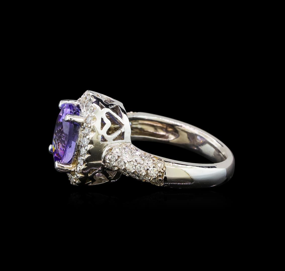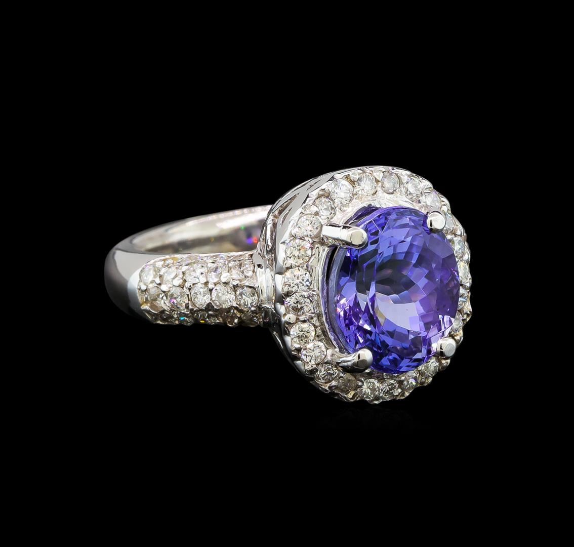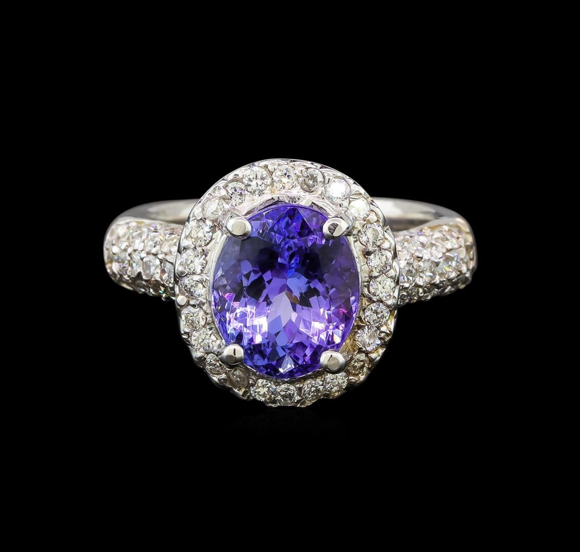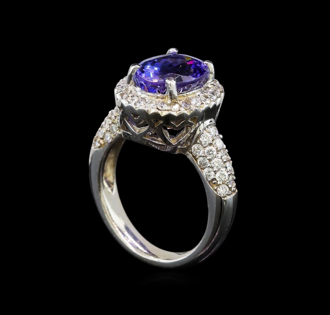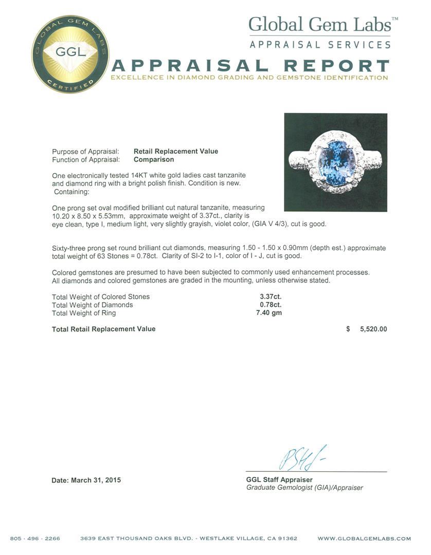One electronically tested 14KT white gold ladies cast tanzanite and diamond ring with a bright polish finish. Condition is new. Containing: One prong set oval modified brilliant cut natural tanzanite, measuring 10.20 x 8.50 x 5.53mm, approximate weight of 3.37ct., clarity is eye clean, type I, medium light, very slightly grayish, violet color, (GIA V 4/3), cut is good. Sixty-Three prong set round brilliant cut diamonds, measuring 1.50 - 1.50 x 0.90mm (depth est.) approximate total weight of 63 Stones = 0.78ct. Clarity: SI-2 to I-1. Color: I - J, Cut is Good. Colored gemstones are presumed to have been subjected to commonly used enhancement processes. All diamonds and colored gemstones are graded in the mounting, unless otherwise stated. Total Weight of Colored Stones 3.37ct. Total Weight of Diamonds 0.78ct. Total Weight of Ring 7.40 grams. GGL Appraised at $5,520.00.