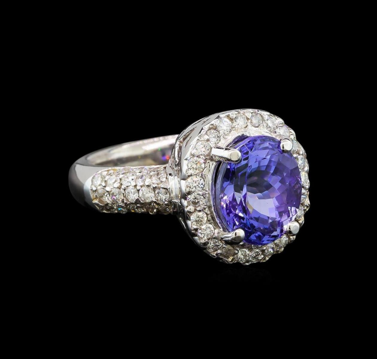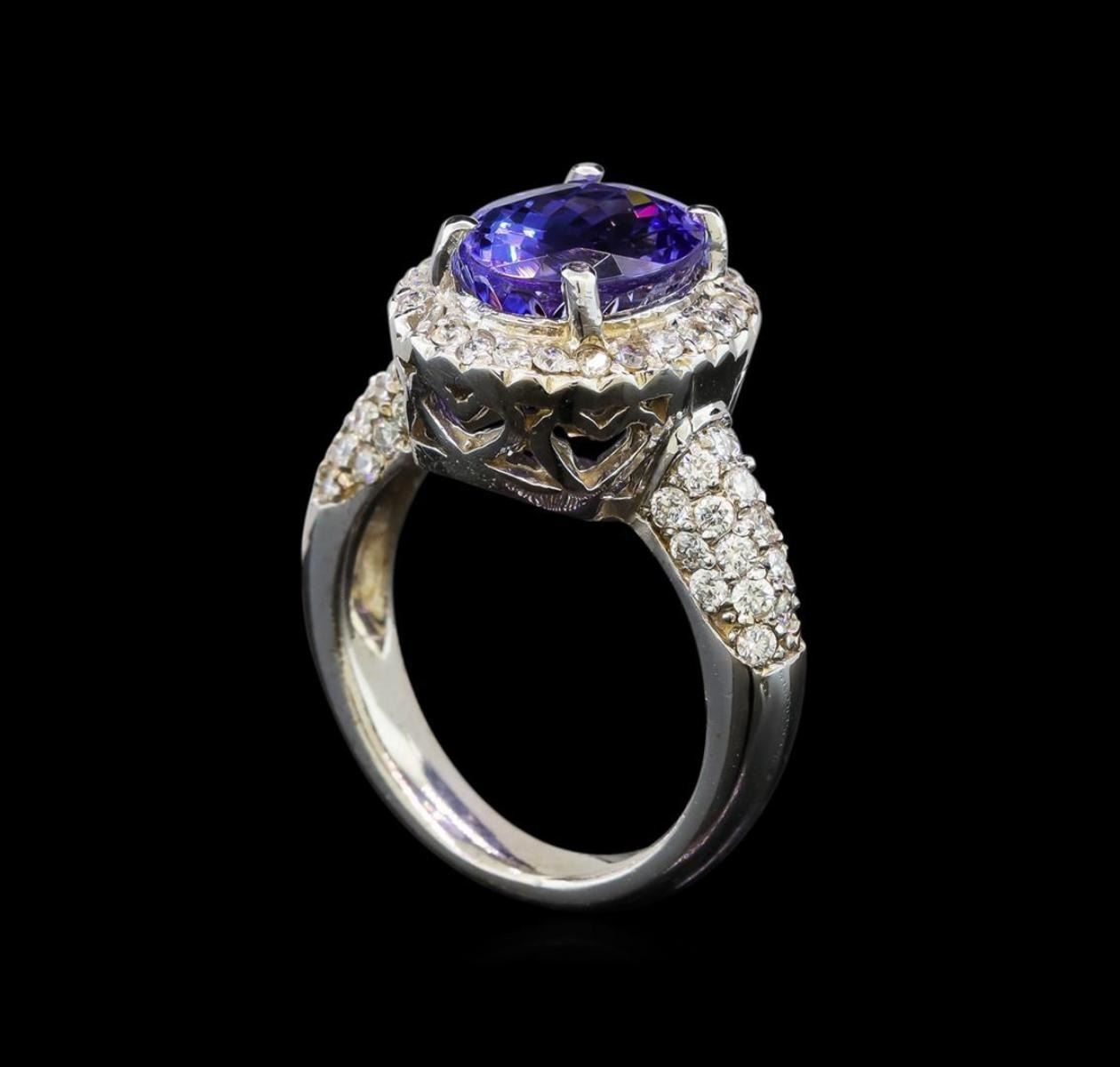 One electronically tested 14KT white gold ladies cast tanzanite and diamond ring with a bright polish finish. Condition is new. Containing: One prong set oval modified brilliant cut natural tanzanite, measuring 10.20 x 8.50 x 5.53mm, approximate weight of 3.37ct., clarity is eye clean, type I, medium light, very slightly grayish, violet color, (GIA V 4/3), cut is good. Sixty-Three prong set round brilliant cut diamonds, measuring 1.50 - 1.50 x 0.90mm (depth est.) approximate total weight of 63 Stones = 0.78ct. Clarity: SI-2 to I-1. Color: I - J, Cut is Good. Colored gemstones are presumed to have been subjected to commonly used enhancement processes. All diamonds and colored gemstones are graded in the mounting, unless otherwise stated. Total Weight of Colored Stones 3.37ct. Total Weight of Diamonds 0.78ct. Total Weight of Ring 7.40 grams. GGL Appraised.