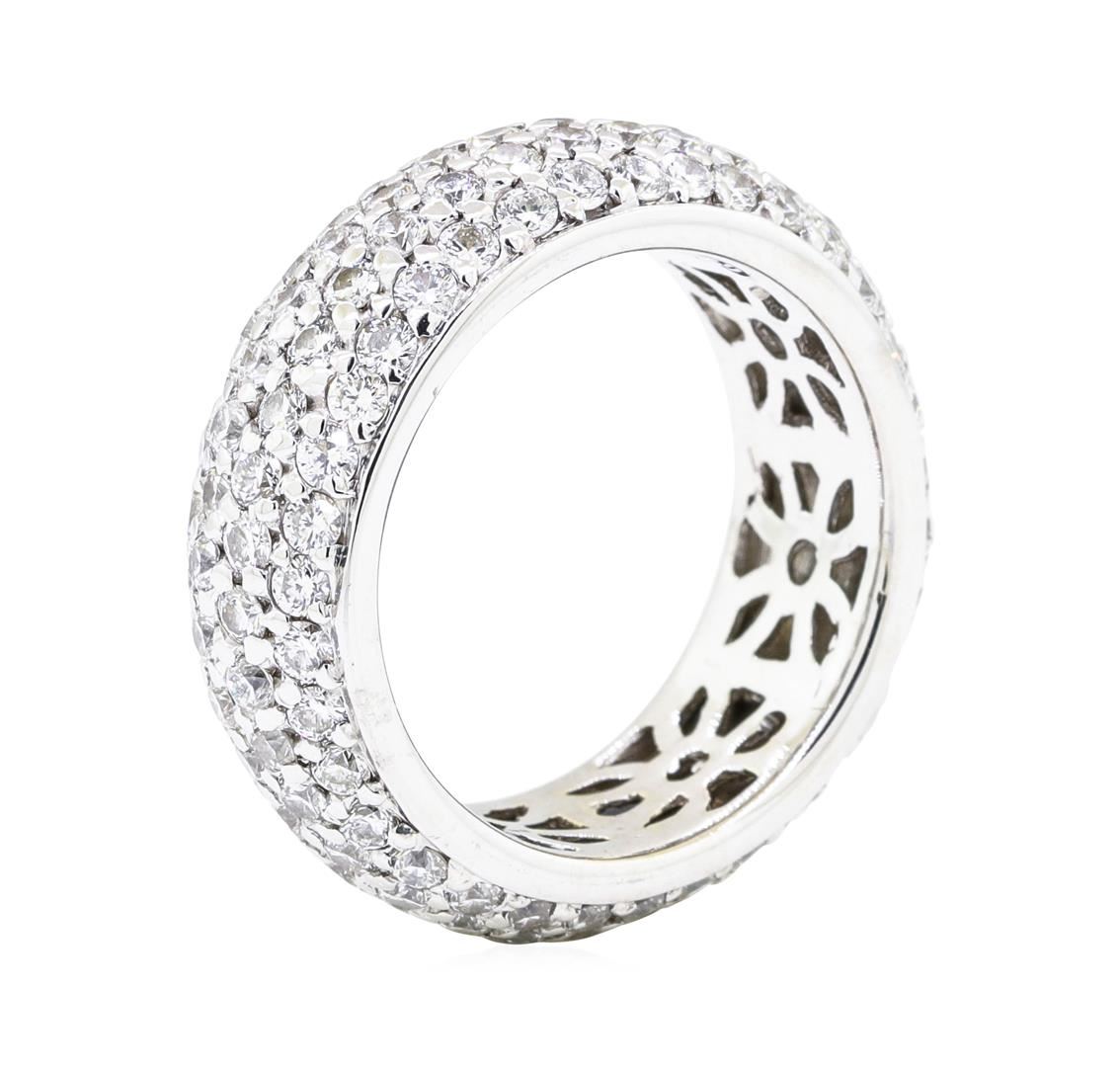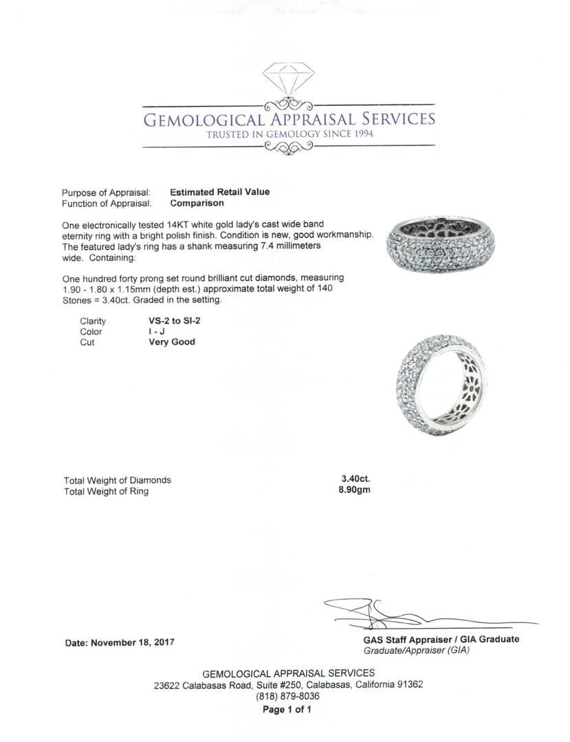 One electronically tested 14KT white gold lady's cast wide band eternity ring with a bright polish finish. The featured lady's ring has a shank measuring 7.4 millimeters wide. Condition is new, good workmanship. Containing: One Hundred Forty prong set round brilliant cut diamonds, measuring 1.90 - 1.80 x 1.15mm (depth est.) approximate total weight of 140 Stones = 3.40ct. Graded in the setting. Color I - J Clarity VS-2 to SI-2 Cut Very Good. Total Weight of Diamonds 3.40ct.. Total Weight of Ring 8.90gm. GAS Appraised.