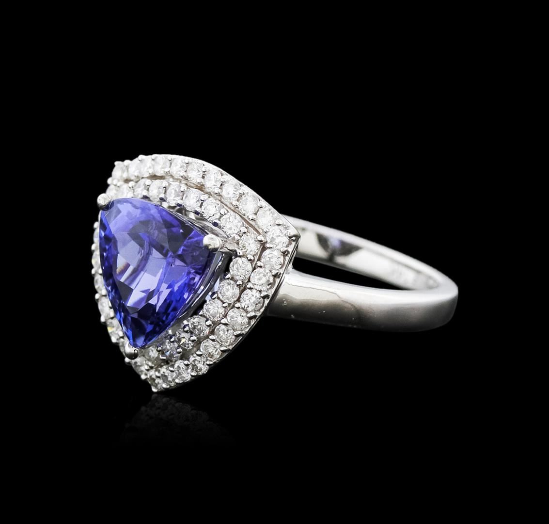 One electronically tested 14KT white gold ladies cast tanzanite and diamond ring with a flat shank with a bright polish finish. Trademark is Orianne. Identified with markings of "14K". Condition is new. Containing: One prong set triangle modified brilliant cut natural tanzanite, measuring 9.00 x 9.00 x 6.97mm, approximate weight of 3.40ct., clarity is eye clean, type I, medium light, very slightly grayish, violetish blue color, (GIA vB 4/3), cut is good. Fifty-One prong set round brilliant cut diamonds, measuring 1.30 - 1.30 x 0.78mm (depth est.) approximate total weight of 51 Stones = 0.41ct. Clarity: SI-2 to I-2. Color: I - J, Cut is Good. All diamonds and colored gemstones are graded in the mounting, unless otherwise stated. Colored gemstones are presumed to have been subjected to commonly used enhancement processes. Total Weight of Colored Stones 3.40ct. Total Weight of Diamonds 0.41ct. Total Weight of Ring 3.90 grams. GGL Appraised at $4,015.00.