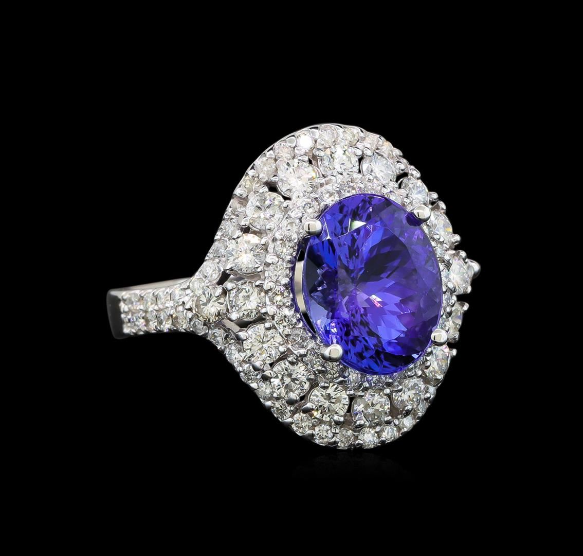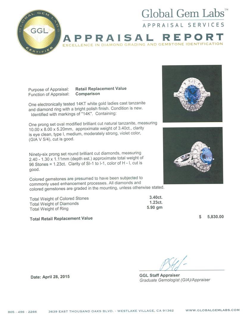 One electronically tested 14KT white gold ladies cast tanzanite and diamond ring with a bright polish finish. Identified with markings of "14K". Condition is new. Containing: One prong set oval modified brilliant cut natural tanzanite, measuring 10.00 x 8.00 x 5.20mm, approximate weight of 3.40ct., clarity is eye clean, type I, medium, moderately strong, violet color, (GIA V 5/4), cut is good. Ninety-Six prong set round brilliant cut diamonds, measuring 2.40 - 1.30 x 1.11mm (depth est.) approximate total weight of 96 Stones = 1.23ct. Clarity: SI-1 to I-1. Color: H - I, Cut is Good. Colored gemstones are presumed to have been subjected to commonly used enhancement processes. All diamonds and colored gemstones are graded in the mounting, unless otherwise stated. Total Weight of Colored Stones 3.40ct. Total Weight of Diamonds 1.23ct. Total Weight of Ring 5.90 grams. GGL Appraised at $5,830.00.