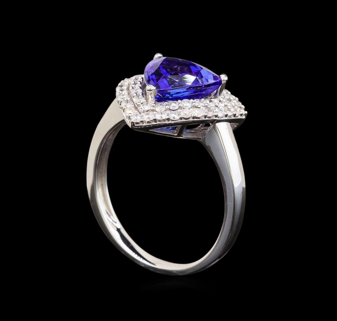 One electronically tested 14KT white gold ladies cast tanzanite and diamond ring with a flat shank with a bright polish finish. Trademark is Orianne. Identified with markings of "14K". Condition is new. Containing: One prong set triangle modified brilliant cut natural tanzanite, measuring 9.00 x 9.00 x 6.97mm, approximate weight of 3.40ct., clarity is eye clean, type I, medium light, very slightly grayish, violetish blue color, (GIA vB 4/3), cut is good. Fifty-One prong set round brilliant cut diamonds, measuring 1.30 - 1.30 x 0.78mm (depth est.) approximate total weight of 51 Stones = 0.41ct. Clarity: SI-2 to I-2. Color: I - J, Cut is Good. All diamonds and colored gemstones are graded in the mounting, unless otherwise stated. Colored gemstones are presumed to have been subjected to commonly used enhancement processes. Total Weight of Colored Stones 3.40ct. Total Weight of Diamonds 0.41ct. Total Weight of Ring 3.90 grams. GGL Appraised at $4,015.00.