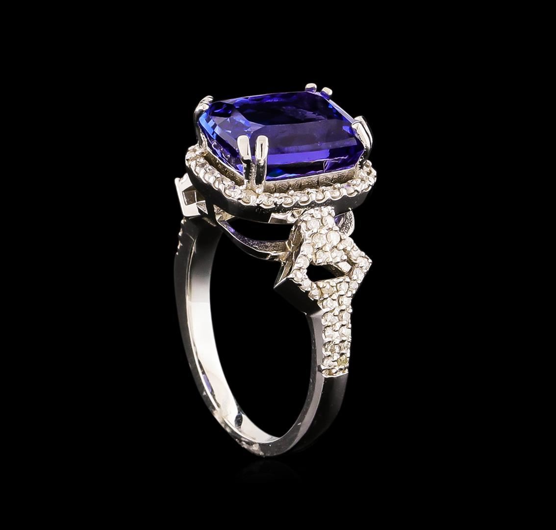 One electronically tested 14KT white gold ladies combination cast & assembled ring with a bright polish finish. Condition is new. Identified with markings of "14K". Containing: One prong set oval modified brilliant cut natural tanzanite, measuring 11.21 x 8.30 x 5.34mm, approximate weight of 3.40ct., clarity is eye clean, type I, medium, moderately strong, bluish violet color, (GIA bV 5/4), cut is good. Seventy-Nine prong set round brilliant cut diamonds, measuring 1.10 - 1.10 x 0.66mm (depth est.) approximate total weight of 79 Stones = 0.38ct. Clarity: I-2 to I-3. Color: H - I, Cut is Good. Colored gemstones are presumed to have been subjected to commonly used enhancement processes. All diamonds and colored gemstones are graded in the mounting, unless otherwise stated. Total Weight of Colored Stones 3.40ct. Total Weight of Diamonds 0.38ct. Total Weight of Ring 6.10 grams. GGL Appraised at $7,190.00.