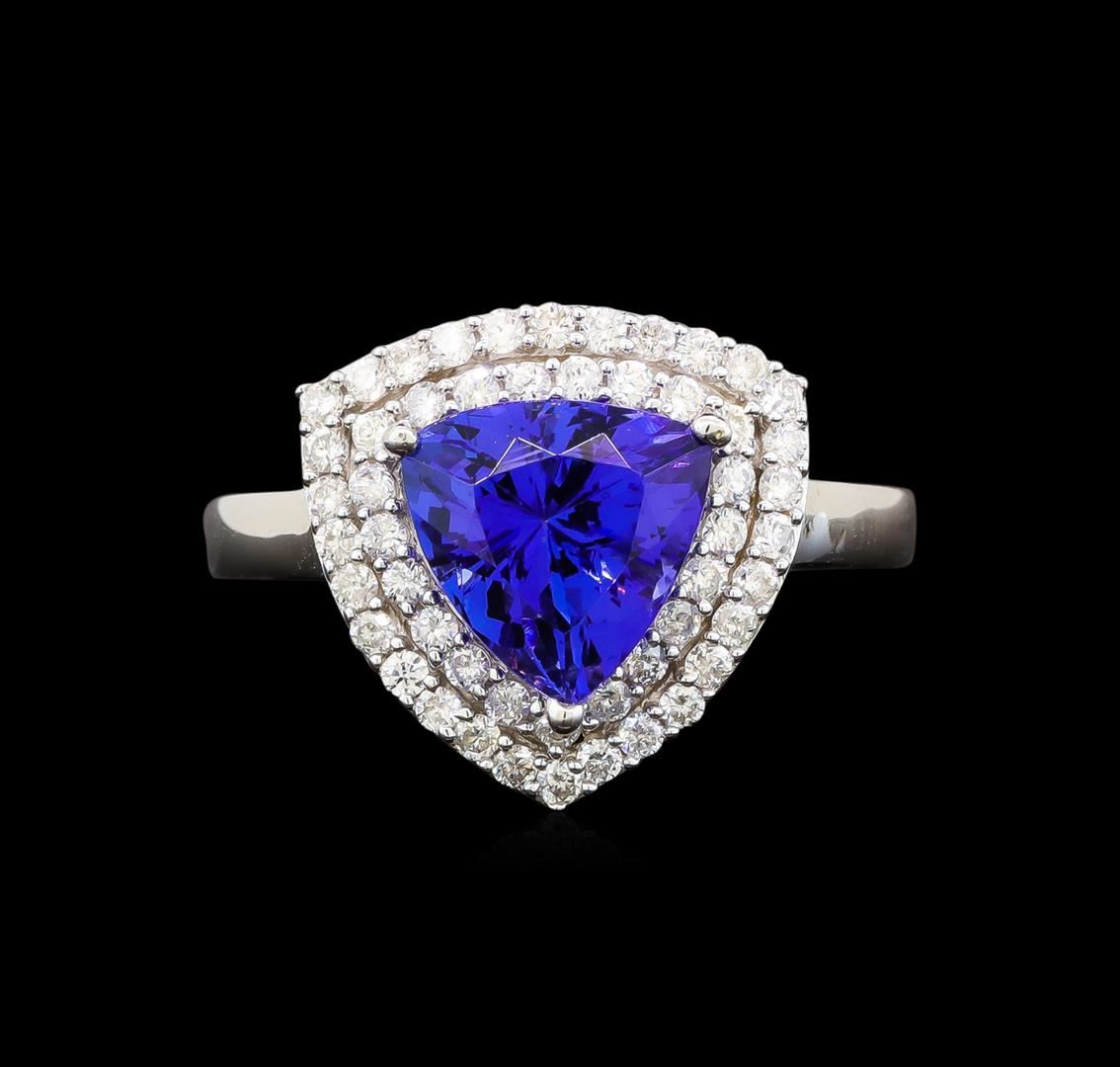 One electronically tested 14KT white gold ladies cast tanzanite and diamond ring with a flat shank with a bright polish finish. Trademark is Orianne. Identified with markings of "14K". Condition is new. Containing: One prong set triangle modified brilliant cut natural tanzanite, measuring 9.00 x 9.00 x 6.97mm, approximate weight of 3.40ct., clarity is eye clean, type I, medium light, very slightly grayish, violetish blue color, (GIA vB 4/3), cut is good. Fifty-One prong set round brilliant cut diamonds, measuring 1.30 - 1.30 x 0.78mm (depth est.) approximate total weight of 51 Stones = 0.41ct. Clarity: SI-2 to I-2. Color: I - J, Cut is Good. All diamonds and colored gemstones are graded in the mounting, unless otherwise stated. Colored gemstones are presumed to have been subjected to commonly used enhancement processes. Total Weight of Colored Stones 3.40ct. Total Weight of Diamonds 0.41ct. Total Weight of Ring 3.90 grams. GGL Appraised at $4,015.00.