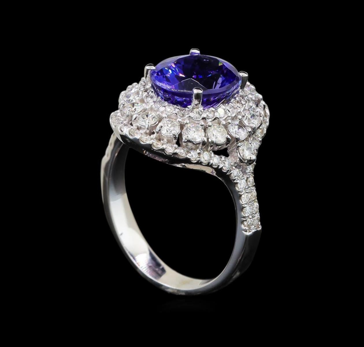 One electronically tested 14KT white gold ladies cast tanzanite and diamond ring with a bright polish finish. Identified with markings of "14K". Condition is new. Containing: One prong set oval modified brilliant cut natural tanzanite, measuring 10.00 x 8.00 x 5.20mm, approximate weight of 3.40ct., clarity is eye clean, type I, medium, moderately strong, violet color, (GIA V 5/4), cut is good. Ninety-Six prong set round brilliant cut diamonds, measuring 2.40 - 1.30 x 1.11mm (depth est.) approximate total weight of 96 Stones = 1.23ct. Clarity: SI-1 to I-1. Color: H - I, Cut is Good. Colored gemstones are presumed to have been subjected to commonly used enhancement processes. All diamonds and colored gemstones are graded in the mounting, unless otherwise stated. Total Weight of Colored Stones 3.40ct. Total Weight of Diamonds 1.23ct. Total Weight of Ring 5.90 grams. GGL Appraised.