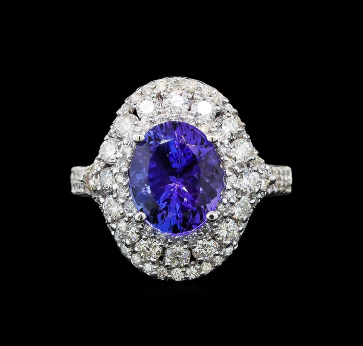 One electronically tested 14KT white gold ladies cast tanzanite and diamond ring with a bright polish finish. Identified with markings of "14K". Condition is new. Containing: One prong set oval modified brilliant cut natural tanzanite, measuring 10.00 x 8.00 x 5.20mm, approximate weight of 3.40ct., clarity is eye clean, type I, medium, moderately strong, violet color, (GIA V 5/4), cut is good. Ninety-Six prong set round brilliant cut diamonds, measuring 2.40 - 1.30 x 1.11mm (depth est.) approximate total weight of 96 Stones = 1.23ct. Clarity: SI-1 to I-1. Color: H - I, Cut is Good. Colored gemstones are presumed to have been subjected to commonly used enhancement processes. All diamonds and colored gemstones are graded in the mounting, unless otherwise stated. Total Weight of Colored Stones 3.40ct. Total Weight of Diamonds 1.23ct. Total Weight of Ring 5.90 grams. GGL Appraised.