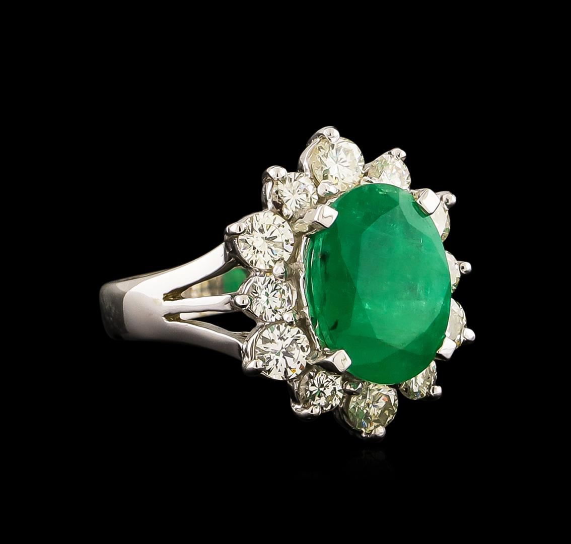 One electronically tested 14KT white gold ladies combination cast & assembled ring with a bright polish finish. Condition is new. Identified with markings of "14K". Containing: One prong set oval modified brilliant cut natural emerald, measuring 11.82 x 8.70 x 5.96mm, approximate weight of 3.41ct., clarity is heavily included, type III, medium, moderately strong, green color, (GIA G 5/4), cut is good. Twelve prong set round brilliant cut diamonds, measuring 3.00 - 2.60 x 1.68mm (depth est.) approximate total weight of 12 Stones = 1.00ct. Clarity: SI-2 to I-1. Color: I - J, Cut is Good. Colored gemstones are presumed to have been subjected to commonly used enhancement processes. All diamonds and colored gemstones are graded in the mounting, unless otherwise stated. Total Weight of Colored Stones 3.41ct. Total Weight of Diamonds 1.00ct. Total Weight of Ring 7.00 grams. GGL Appraised.
