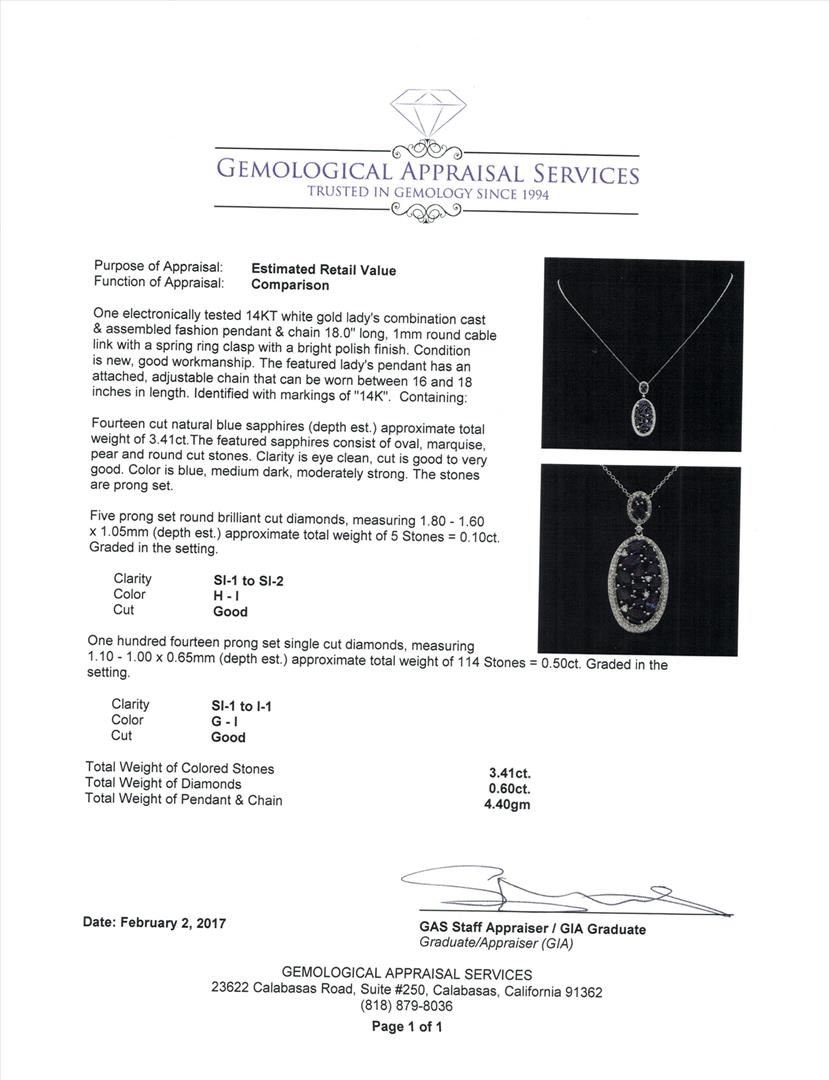 One electronically tested 14KT white gold lady's combination cast & assembled fashion pendant & chain 18.0" long, 1mm round cable link with a spring ring clasp with a bright polish finish. The featured lady's pendant has an attached, adjustable chain that can be worn between 16 and 18 inches in length. Identified with markings of "14K". Condition is new, good workmanship. Containing: Fourteen cut natural blue sapphires (depth est.) approximate total weight of 3.41ct.The featured sapphires consist of oval, marquise, pear and round cut stones. Clarity is eye clean, cut is good to very good. Color is blue, medium dark, moderately strong. The stones are prong set.Five prong set round brilliant cut diamonds, measuring 1.80 - 1.60 x 1.05mm (depth est.) approximate total weight of 5 Stones = 0.10ct. Graded in the setting. Clarity: SI-1 to SI-2. Color: H - ICut Good One Hundred Fourteen prong set single cut diamonds, measuring 1.10 - 1.00 x 0.65mm (depth est.) approximate total weight of 114 Stones = 0.50ct. Graded in the setting. Clarity: SI-1 to I-1. Color: G - ICut Good. Total Weight of Colored Stones 3.41ct. Total Weight of Diamonds 0.60ct. Total Weight of Pendant & Chain 4.40gm. GAS Appraised.
