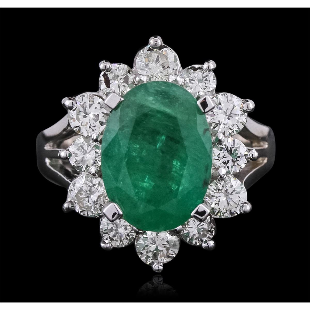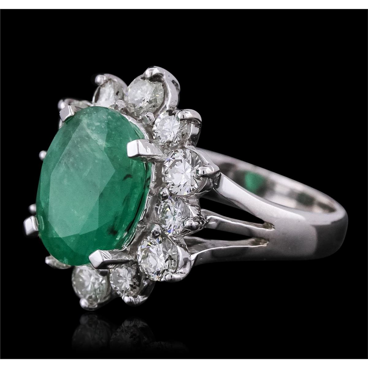 One electronically tested 14KT white gold ladies combination cast & assembled ring with a bright polish finish. Condition is new. Identified with markings of "14K". Containing: One prong set oval modified brilliant cut natural emerald, measuring 11.82 x 8.70 x 5.96mm, approximate weight of 3.41ct., clarity is heavily included, type III, medium, moderately strong, green color, (GIA G 5/4), cut is good. Twelve prong set round brilliant cut diamonds, measuring 3.00 - 2.60 x 1.68mm (depth est.) approximate total weight of 12 Stones = 1.00ct. Clarity: SI-2 to I-1. Color: I - J, Cut is Good. Colored gemstones are presumed to have been subjected to commonly used enhancement processes. All diamonds and colored gemstones are graded in the mounting, unless otherwise stated. Total Weight of Colored Stones 3.41ct. Total Weight of Diamonds 1.00ct. Total Weight of Ring 7.00 grams. GGL Appraised at $11,650.00.