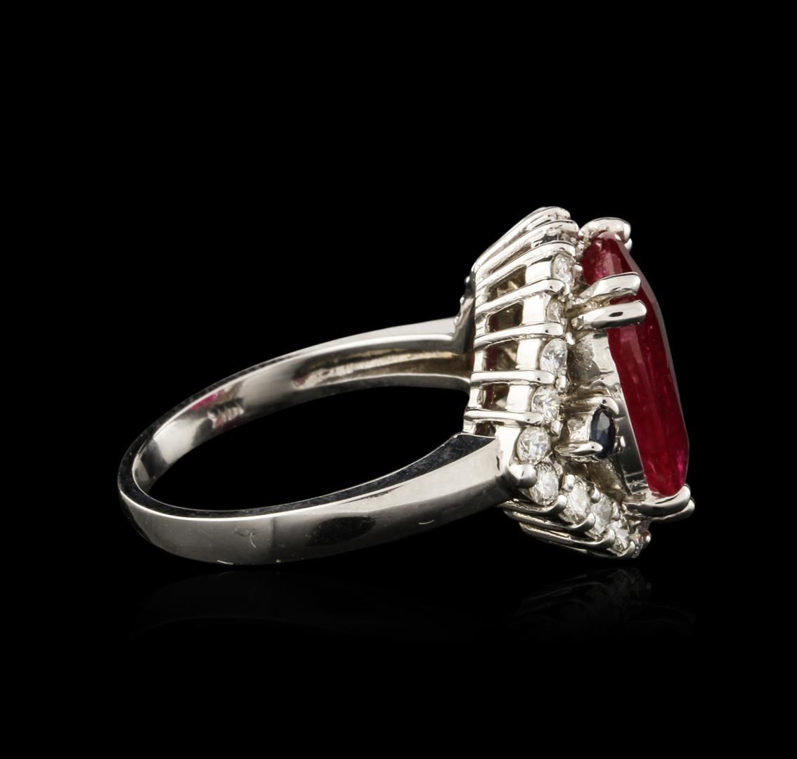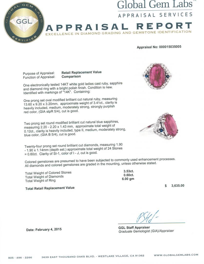 One electronically tested 14KT white gold ladies cast ruby, sapphire and diamond ring with a bright polish finish. Identified with markings of "14K". Condition is new. Containing: One prong set oval modified brilliant cut natural ruby, measuring 13.60 x 9.20 x 3.20mm, approximate weight of 3.41ct., clarity is heavily included, medium, moderately strong, strongly purplish red color, (GIA stpR 5/4), cut is good. Two prong set round modified brilliant cut natural blue sapphires, measuring 2.20 - 2.20 x 1.43 mm, approximate total weight of 0.12ct., clarity is heavily included, type II, medium, moderately strong, blue color, (GIA B 5/4), cut is good. Twenty-Four prong set round brilliant cut diamonds, measuring 1.90 - 1.90 x 1.14mm (depth est.) approximate total weight of 24 Stones = 0.60ct. Clarity: SI-1. Color: I - J, Cut is Good. Colored gemstones are presumed to have been subjected to commonly used enhancement processes. All diamonds and colored gemstones are graded in the mounting, unless otherwise stated. Total Weight of Colored Stones 3.53ct. Total Weight of Diamonds 0.60ct. Total Weight of Ring 6.00 grams. GGL Appraised at $3,635.00.