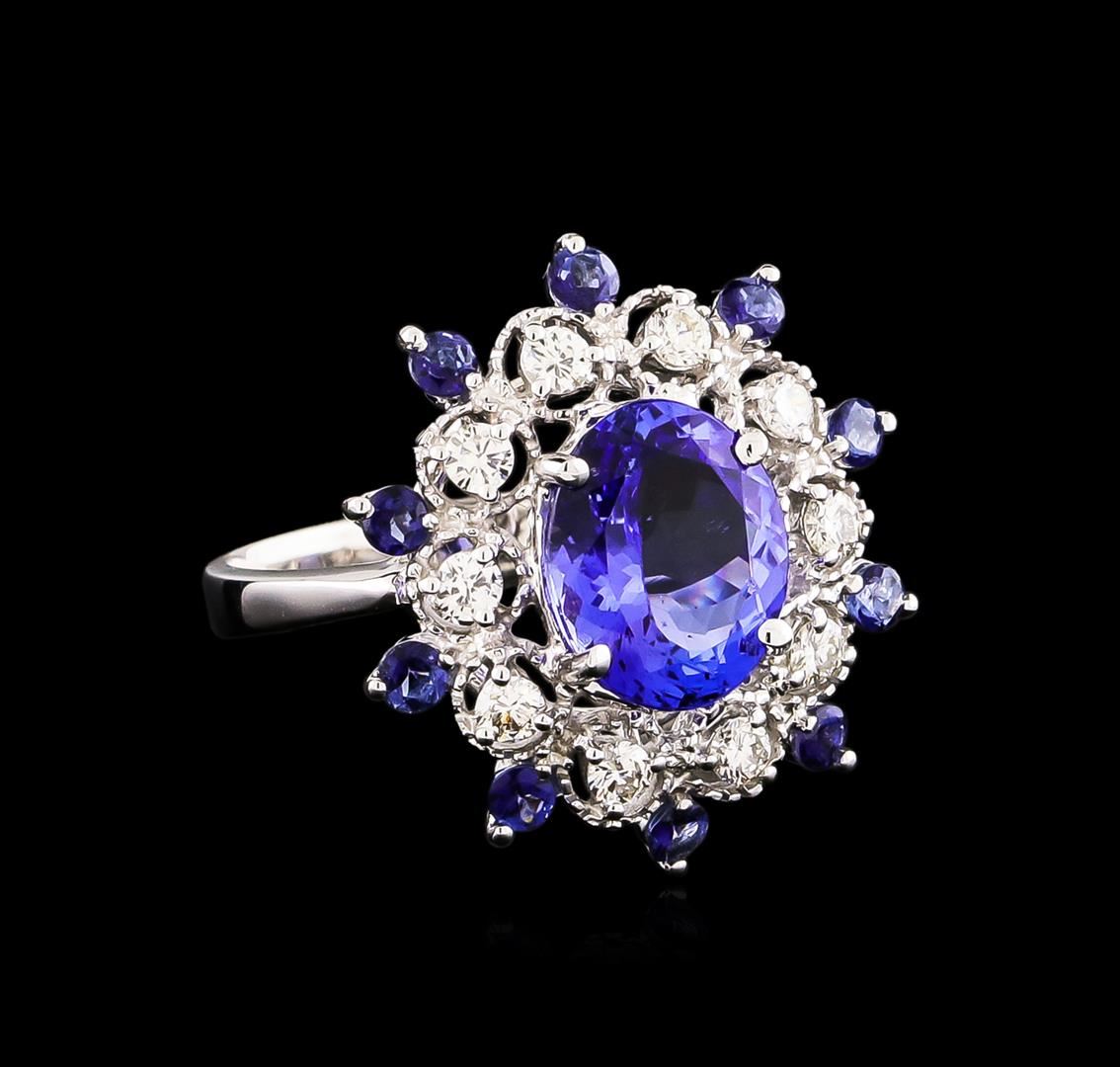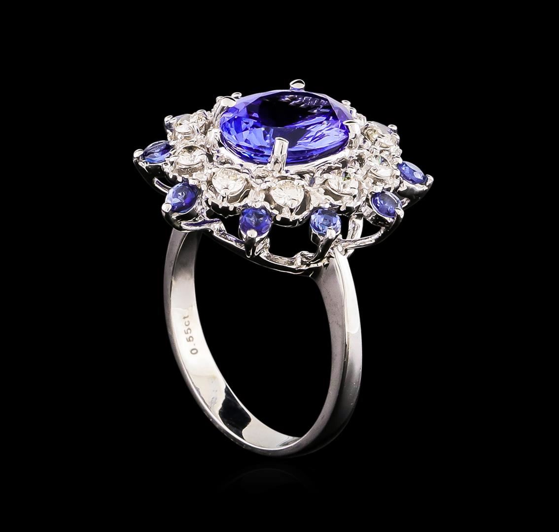 One electronically tested 14KT white gold Ladies combination cast & assembled ring with a bright polish finish. Condition is new. Identified with markings of "14K". Containing: One prong set oval modified brilliant cut natural tanzanite, measuring 10.40 x 8.50 x 4.90mm, approximate weight of 2.93ct., clarity is eye clean, type I, medium light, very slightly grayish, bluish violet color, (GIA bV 4/3), cut is good. Ten prong set round modified brilliant cut natural tanzanites, measuring 2.20 - 2.20 x 1.43 mm, approximate. Total Weight of 0.50ct., clarity is eye clean, type I, medium light, very slightly grayish, bluish violet color, (GIA bV 4/3), cut is very good. Colored gemstones are presumed to have been subjected to commonly used color/clarity enhancement processes. Ten prong set round brilliant cut diamonds, measuring 2.20 - 2.20 x 1.32mm (depth est.) approximate. Total Weight of 10 Stones = 0.39ct. Clarity: SI-2 to I-1. Color: H - I, Cut is Good. All grading of diamonds and colored gemstones in this piece of jewelry are graded in the mounting, unless otherwise stated. Total Weight of Colored Stones 3.43ct. Total Weight of Diamonds 0.39ct. Total Weight of Ring 5.50 grams. GGL Appraised at $7,450.00.