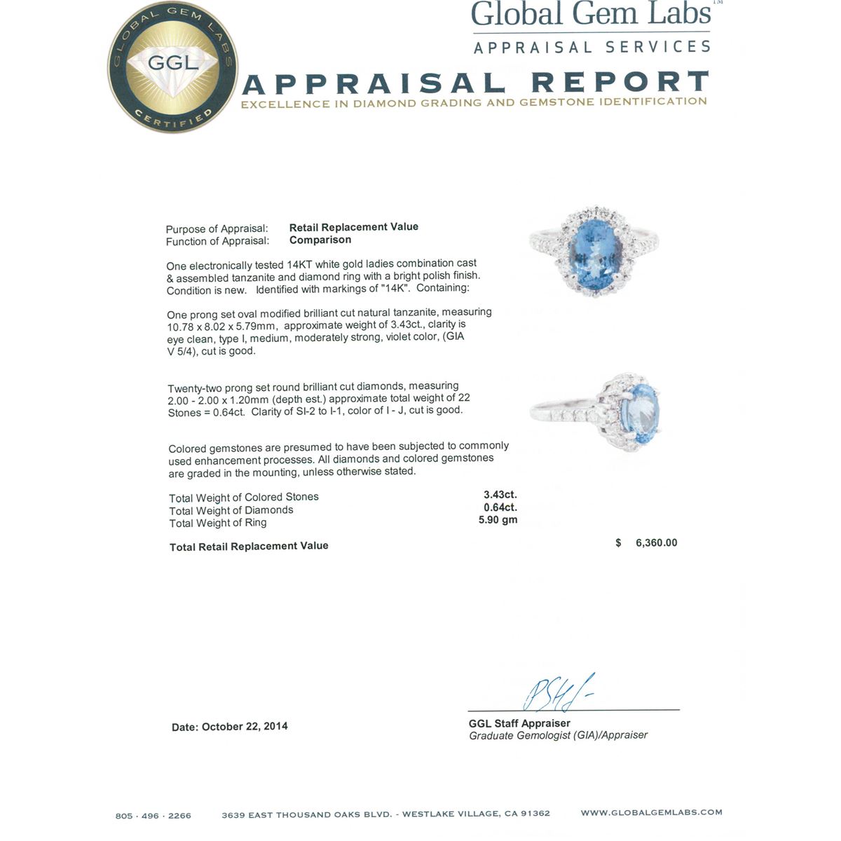One electronically tested 14KT white gold ladies combination cast & assembled tanzanite and diamond ring with a bright polish finish. Identified with markings of "14K". Condition is new. Containing: One prong set oval modified brilliant cut natural tanzanite, measuring 10.78 x 8.02 x 5.79mm, approximate weight of 3.43ct., clarity is eye clean, type I, medium, moderately strong, violet color, (GIA V 5/4), cut is good. Twenty-Two prong set round brilliant cut diamonds, measuring 2.00 - 2.00 x 1.20mm (depth est.) approximate total weight of 22 Stones = 0.64ct. Clarity: SI-2 to I-1. Color: I - J, Cut is Good. Colored gemstones are presumed to have been subjected to commonly used enhancement processes. All diamonds and colored gemstones are graded in the mounting, unless otherwise stated. Total Weight of Colored Stones 3.43ct. Total Weight of Diamonds 0.64ct. Total Weight of Ring 5.90 grams. GGL Appraised at $6,360.00.