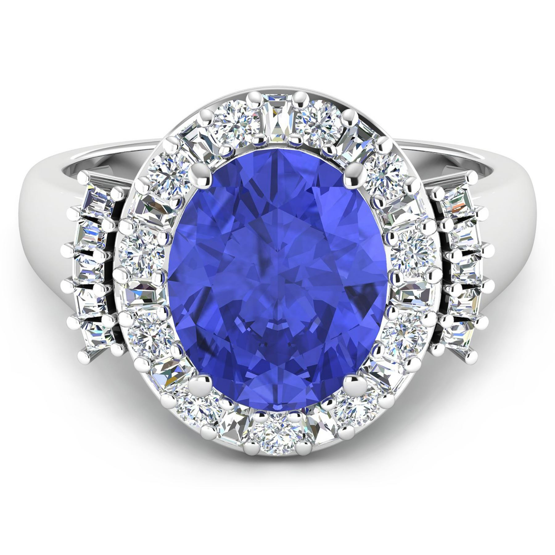 Tanzanite (AA+) Oval 11x9mm - 1Pc + White Diamond Tapper Baguette 2.00x1.50x1.10mm - 11Pcs + White Diamond Tapper Baguette 1.50x1.40x1.00mm - 10Pcs + White Diamond F/C Round 2.00mm - 11Pcs ( Diamond Quality : SI-2/HI ). Total weight of gemstone is 3.43cts. Total weight of Diamonds is 0.83cts. Total weight of this ring is 4.72 grams. Ring size 7.